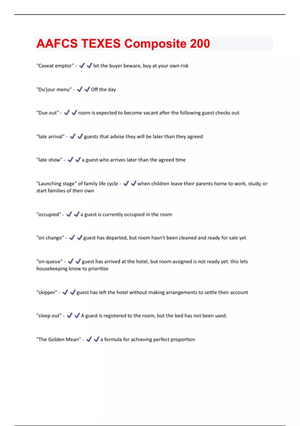 "Caveat emptor" - let the buyer beware, buy at your own risk "Du'jour menu" - Off the day "Due out" - room is expected to become vacant after the following guest checks out "late arrival" - guests that advise they will be later than they agreed "late show" - a guest who arrives later than the agreed time "Launching stage" of family life cycle - when children leave their parents home to work, study, or start families of their own "occupied" - a guest is currently occupied in the room "on change" - guest has departed, but room hasn't been cleaned and ready for sale yet "on-queue" - guest has arrived at the hotel, but room assigned is not ready yet. this lets housekeeping know to prioritize "skipper" - guest has left the hotel without making arrangements to settle their account "sleep out" - A guest is registered to the room, but the bed has not been used. "The Golden Mean" - a formula for achieving perfect proportion"vacant and ready" - The room has been cleaned and inspected and is ready for an arriving guest. a difficulty of enforcing laws designed o prevent deceptive advertising is: - intent to deceive is difficult to prove A family is good with repairs, but has limited resources. What type of house should they purchase? - an older home with minor repairs a new full service hotel is being held in a historical part of town near a bird sanctuary that attract many tourists. Considering the hotel location, who should management target? - transients, education and corporate a person complains about a loud neighbor and the hotel staff moves him to another room, what is it called? - Credit per Marilyn a savings account yields the highest return when interest is compounded - the more often the better daily, monthly, or quarterly a toddler is crying uncontrollably, what should the grandparents do - rock her and talk softly to her Adjust balance method - -best -interest rate is applied to the balance of the bill after payment has been applied -balance is determined by subtracting payments or credits received during billing period from the previous billing period advantage of large classes - greater access to resources Ashlar - stone that is cut to have more uniform rectilinear or straight shape. Great material to utilize for interior and exterior wallsassociate play - -stage 3 -3-4 years -occurs when children begin to participate in game or activities together -increased interest in peers