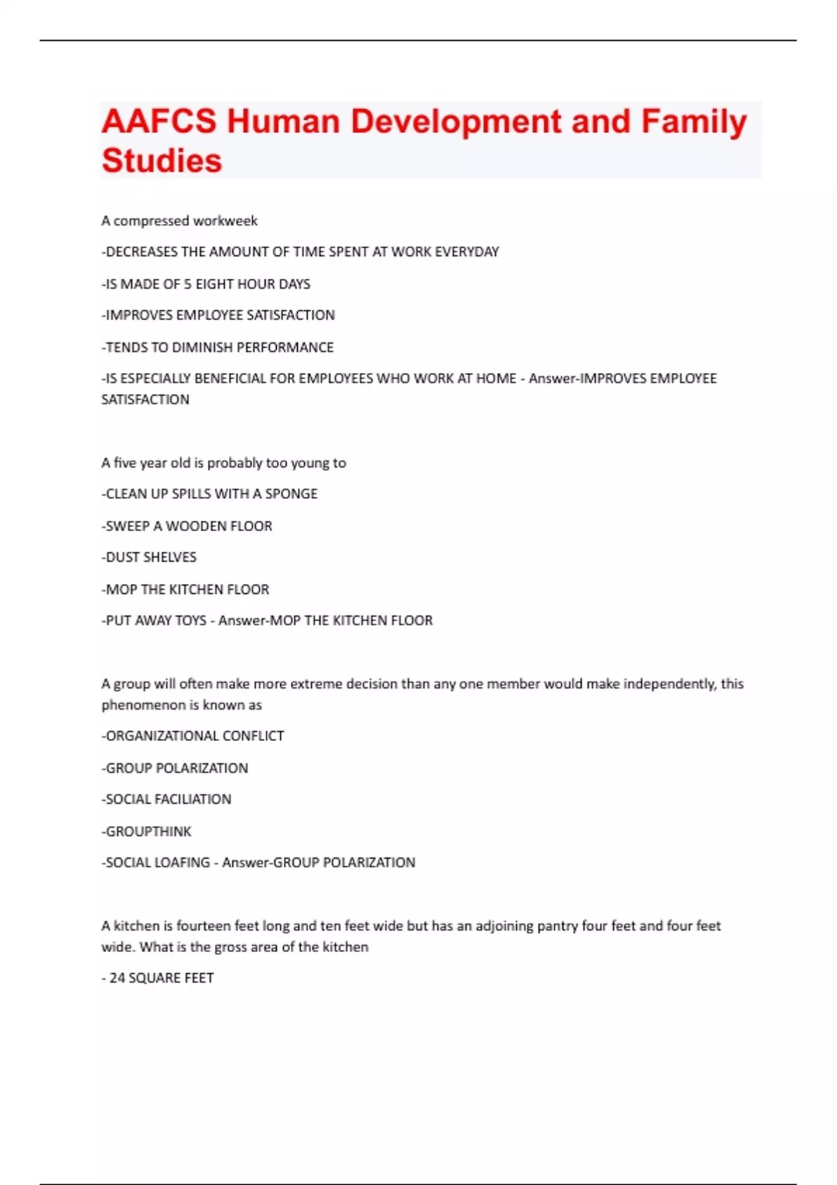 A compressed workweek -DECREASES THE AMOUNT OF TIME SPENT AT WORK EVERYDAY -IS MADE OF 5 EIGHT HOUR DAYS -IMPROVES EMPLOYEE SATISFACTION -TENDS TO DIMINISH PERFORMANCE -IS ESPECIALLY BENEFICIAL FOR EMPLOYEES WHO WORK AT HOME - Answer-IMPROVES EMPLOYEE SATISFACTION A five year old is probably too young to -CLEAN UP SPILLS WITH A SPONGE -SWEEP A WOODEN FLOOR -DUST SHELVES -MOP THE KITCHEN FLOOR -PUT AWAY TOYS - Answer-MOP THE KITCHEN FLOOR A group will often make more extreme decision than any one member would make independently, this phenomenon is known as -ORGANIZATIONAL CONFLICT -GROUP POLARIZATION -SOCIAL FACILIATION -GROUPTHINK -SOCIAL LOAFING - Answer-GROUP POLARIZATION A kitchen is fourteen feet long and ten feet wide but has an adjoining pantry four feet and four feet wide. What is the gross area of the kitchen - 24 SQUARE FEET- 32 SQUARE FEET - 140 SQUARE FEET - 156 SQUARE FEET - 2240 SQUARE FEET - Answer-156 SQUARE FEET A lesson plan calls for students to act out a negotiation in which pairs of students try to settle a hypothetical dispute between a husband and a wife over money. Which learning disability might prevent a student from succeeding at this task - DYSSEMIA - DYSGRAPHIA - DYSLEXIA - A VISUAL PERCEPTION DISORDER - Answer-DYSSEMIA