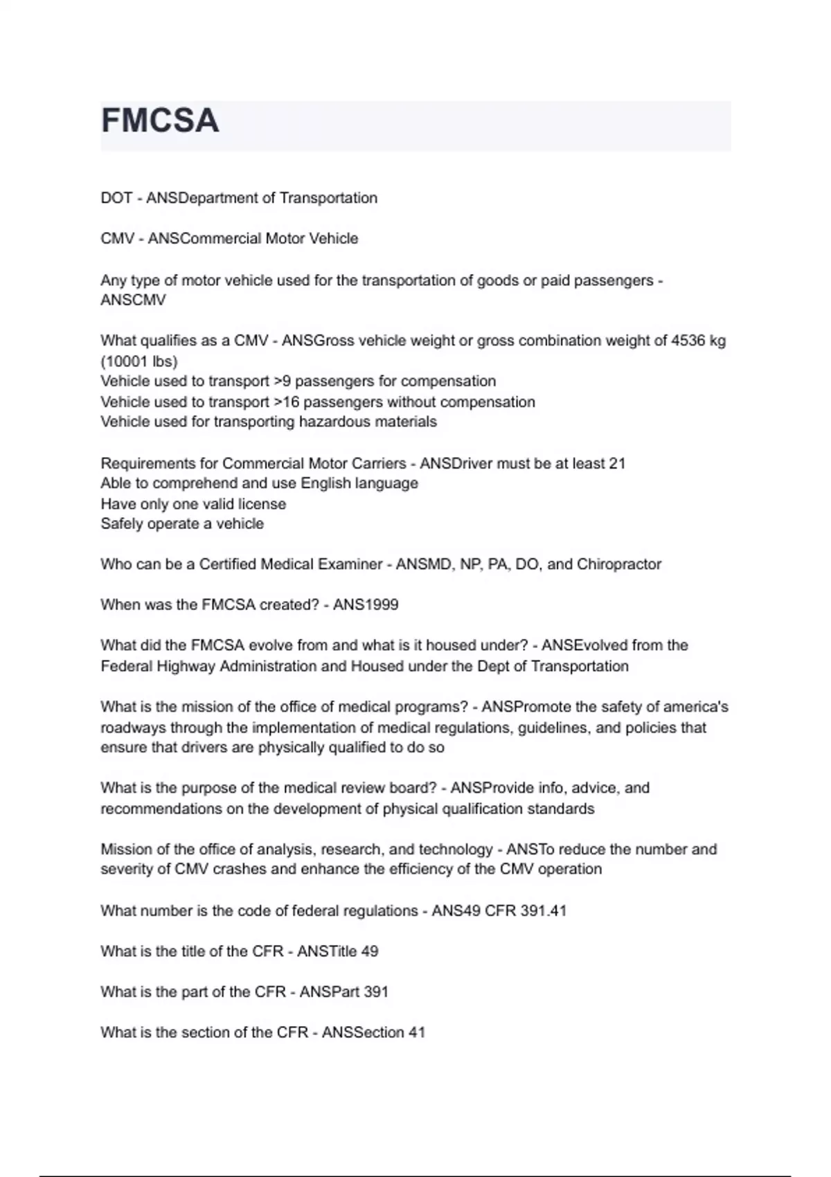 FMCSA questions and answers graded A+ by experts 2024/2025