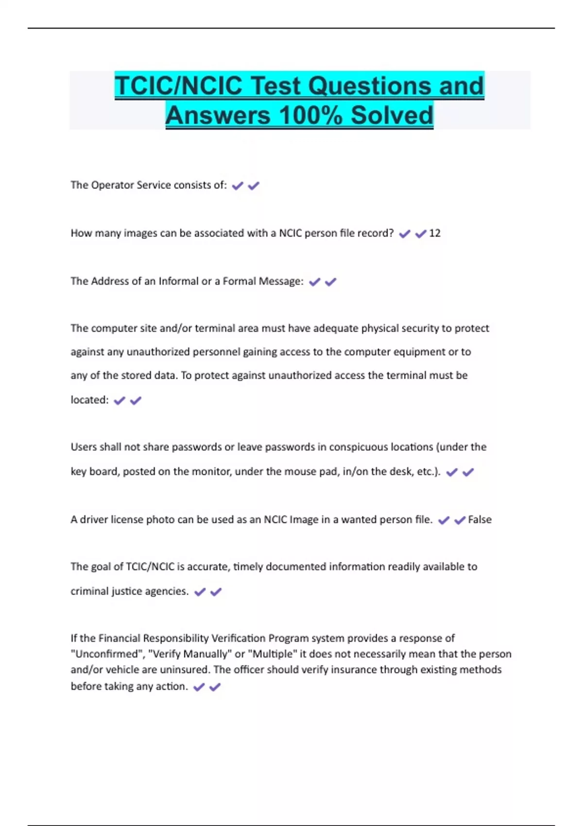 TCIC/NCIC Test Questions and Answers 100% Solved The Operator Service consists of: How many images can be associated with a NCIC person file record? 12 The Address of an Informal or a Formal Message: The computer site and/or terminal area must have adequate physical security to protect against any unauthorized personnel gaining access to the computer equipment or to any of the stored data. To protect against unauthorized access the terminal must be located: Users shall not share passwords or leave passwords in conspicuous locations (under the key board, posted on the monitor, under the mouse pad, in/on the desk, etc.). A driver license photo can be used as an NCIC Image in a wanted person file. False