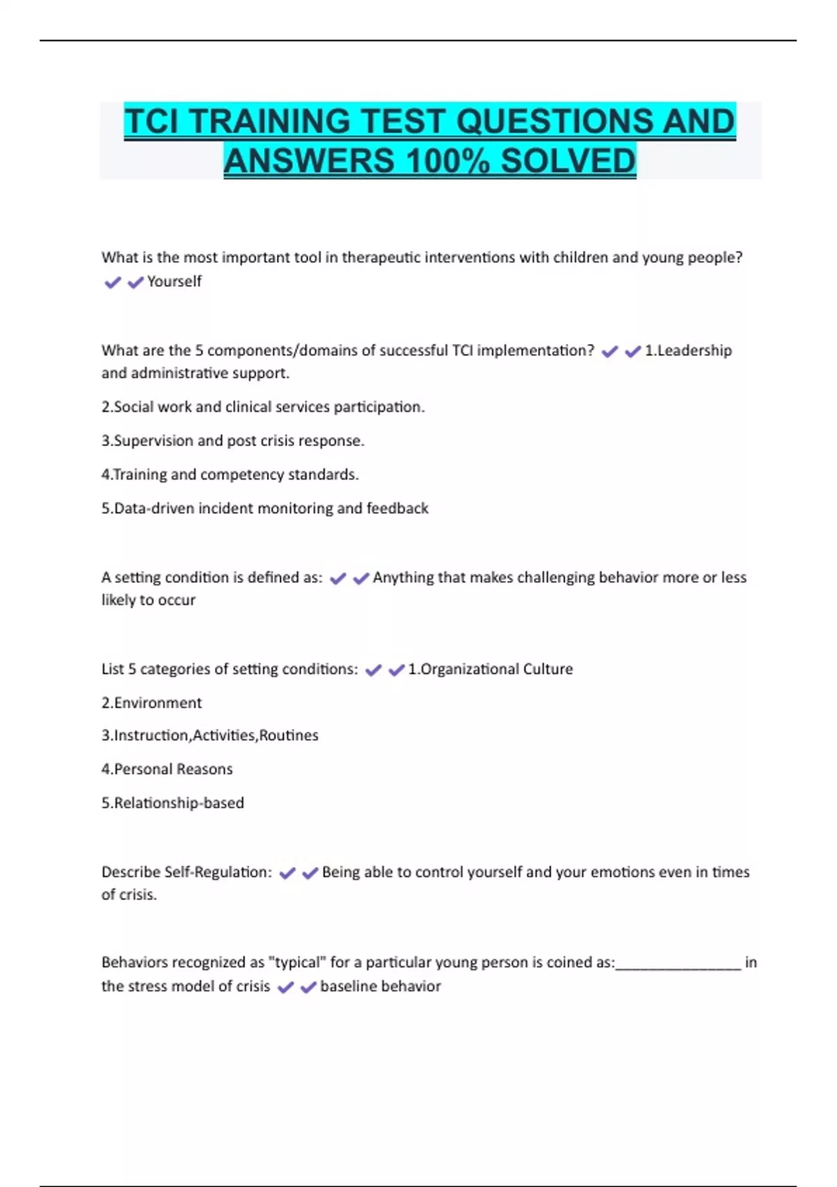 TCI TRAINING TEST QUESTIONS AND ANSWERS 100% SOLVED What is the most important tool in therapeutic interventions with children and young people? Yourself What are the 5 components/domains of successful TCI implementation? 1.Leadership and administrative support. 2.Social work and clinical services participation. 3.Supervision and post crisis response. 4.Training and competency standards. 5.Data-driven incident monitoring and feedback A setting condition is defined as: Anything that makes challenging behavior more or less likely to occur List 5 categories of setting conditions: 1.Organizational Culture 2.Environment 3.Instruction,Activities,Routines 4.Personal Reasons 5.Relationship-based