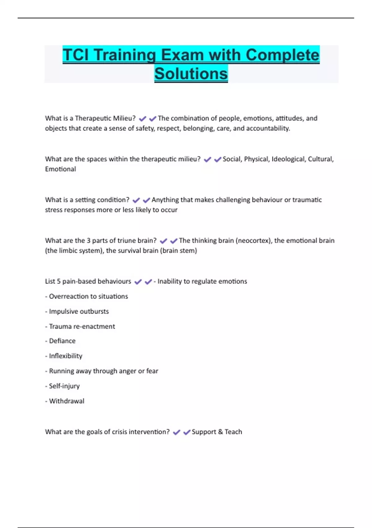 TCI Training Exam with Complete Solutions What is a Therapeutic Milieu? The combination of people, emotions, attitudes, and objects that create a sense of safety, respect, belonging, care, and accountability. What are the spaces within the therapeutic milieu? Social, Physical, Ideological, Cultural, Emotional What is a setting condition? Anything that makes challenging behaviour or traumatic stress responses more or less likely to occur What are the 3 parts of triune brain? The thinking brain (neocortex), the emotional brain (the limbic system), the survival brain (brain stem) List 5 pain-based behaviours - Inability to regulate emotions - Overreaction to situations - Impulsive outbursts - Trauma re-enactment - Defiance - Inflexibility - Running away through anger or fear - Self-injury - Withdrawa