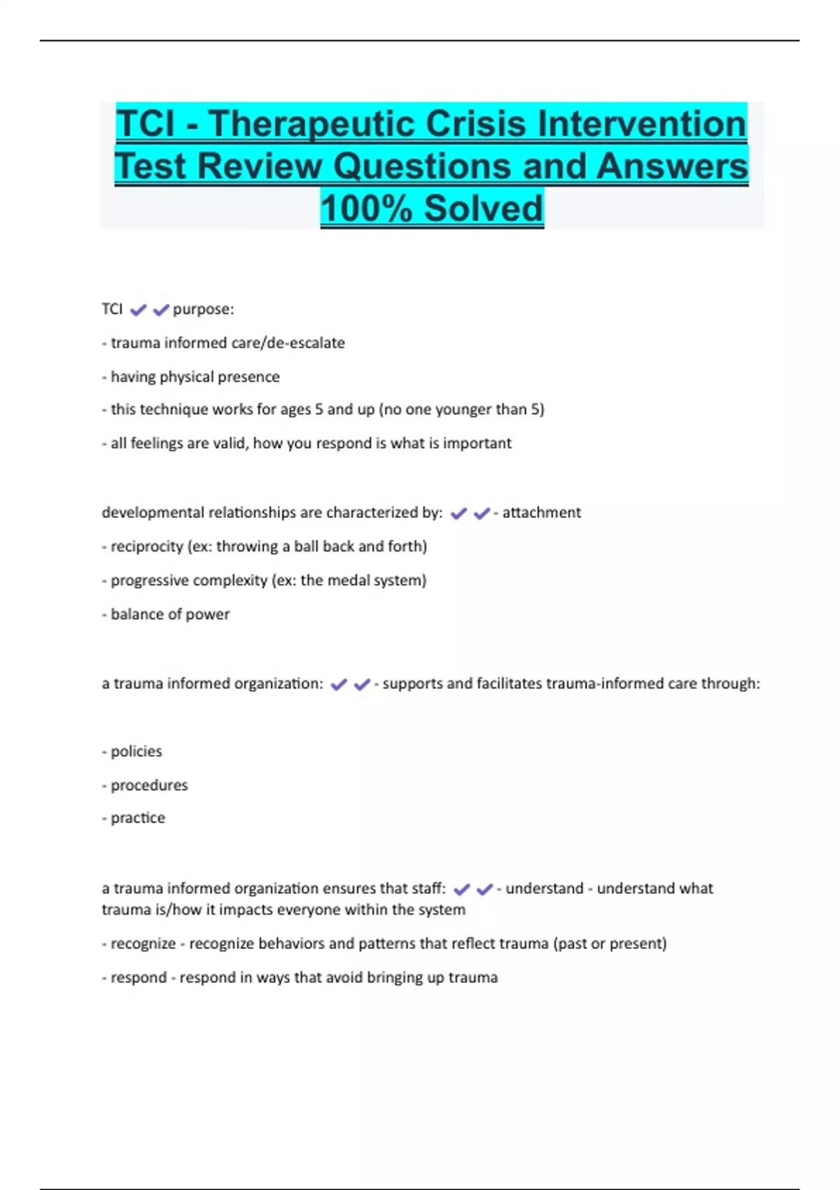 TCI - Therapeutic Crisis Intervention Test Review Questions and Answers 100% Solved TCI purpose: - trauma informed care/de-escalate - having physical presence - this technique works for ages 5 and up (no one younger than 5) - all feelings are valid, how you respond is what is important developmental relationships are characterized by: - attachment - reciprocity (ex: throwing a ball back and forth) - progressive complexity (ex: the medal system) - balance of power a trauma informed organization: - supports and facilitates trauma-informed care through: - policies - procedures - practice a trauma informed organization ensures that staff: - understand - understand what trauma is/how it impacts everyone within the system - recognize - recognize behaviors and patterns that reflect trauma (past or present) - respond - respond in ways that avoid bringing up trauma