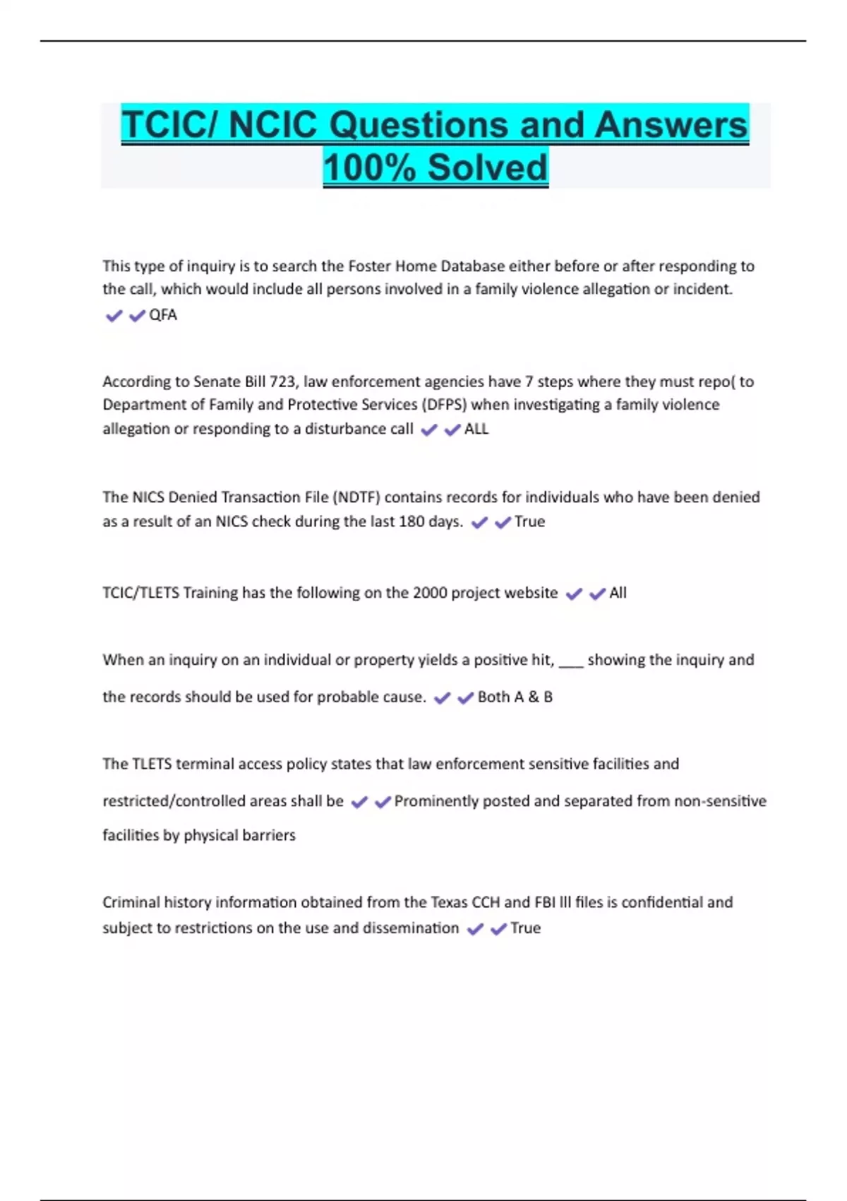 TCIC/ NCIC Questions and Answers 100% Solved This type of inquiry is to search the Foster Home Database either before or after responding to the call, which would include all persons involved in a family violence allegation or incident. QFA According to Senate Bill 723, law enforcement agencies have 7 steps where they must repo( to Department of Family and Protective Services (DFPS) when investigating a family violence allegation or responding to a disturbance call ALL The NICS Denied Transaction File (NDTF) contains records for ind