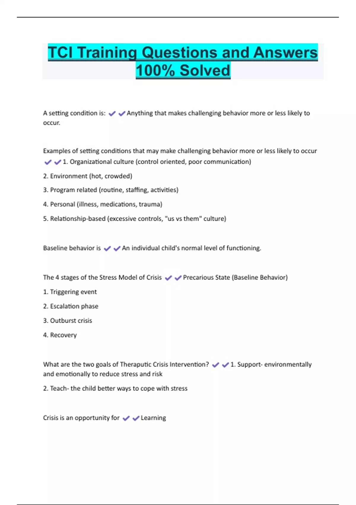 TCI Training Questions and Answers 100% Solved A setting condition is: Anything that makes challenging behavior more or less likely to occur. Examples of setting conditions that may make challenging behavior more or less likely to occur 1. Organizational culture (control oriented, poor communication) 2. Environment (hot, crowded) 3. Program related (routine, staffing, activities) 4. Personal (illness, medications, trauma) 5. Relationship-based (excessive controls, "us vs them" culture) Baseline behavior is An individual child's normal level of functioning. The 4 stages of the Stress Model of Crisis Precarious State (Baseline Behavior) 1. Triggering event 2. Escalation phase 3. Outburst crisis 4. Recover