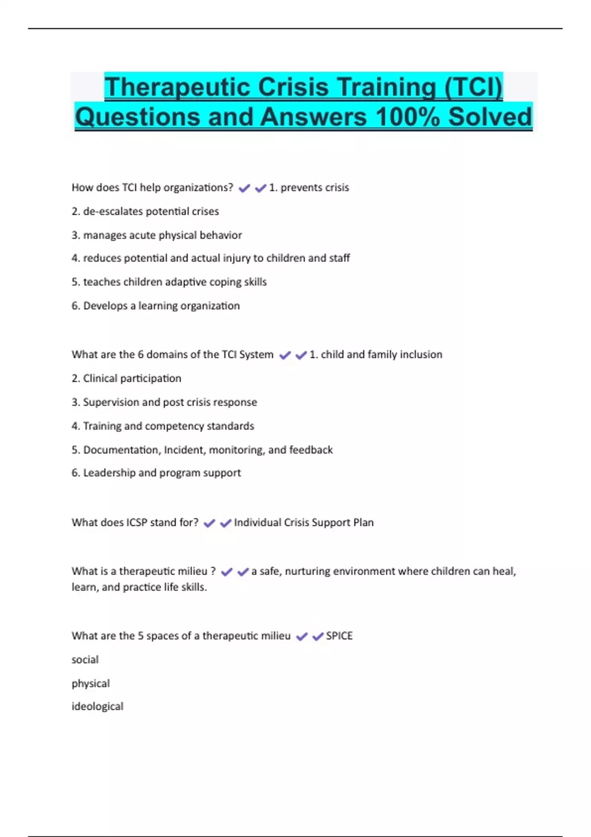Therapeutic Crisis Training (TCI) Questions and Answers 100% Solved How does TCI help organizations? 1. prevents crisis 2. de-escalates potential crises 3. manages acute physical behavior 4. reduces potential and actual injury to children and staff 5. teaches children adaptive coping skills 6. Develops a learning organization What are the 6 domains of the TCI System 1. child and family inclusion 2. Clinical participation 3. Supervision and post crisis response 4. Training and competency standards 5. Documentation, Incident, monitoring, and feedback 6. Leadership and program support What does ICSP stand for? Individual Crisis Support Plan What is a therapeutic milieu ? a safe, nurturing environment where children can heal, learn, and practice life skills. What are the 5 spaces of a therapeutic milieu SPICE