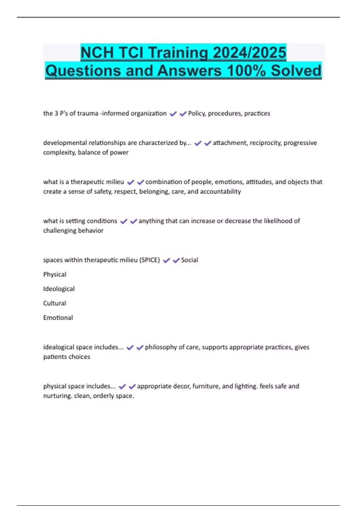 NCH TCI Training 2024/2025 Questions and Answers 100% Solved the 3 P's of trauma -informed organization Policy, procedures, practices developmental relationships are characterized by... attachment, reciprocity, progressive complexity, balance of power what is a therapeutic milieu combination of people, emotions, attitudes, and objects that create a sense of safety, respect, belonging, care, and accountability what is setting conditions anything that can increase or decrease the likelihood of challenging behavior spaces within therapeutic milieu (SPICE) Social Physical Ideological Cultural Emotional idealogical space includes... philosophy of care, supports appropriate practices, gives patients choices physical space includes... appropriate decor, furniture, and lighting. feels safe and nurturing. clean, orderly space