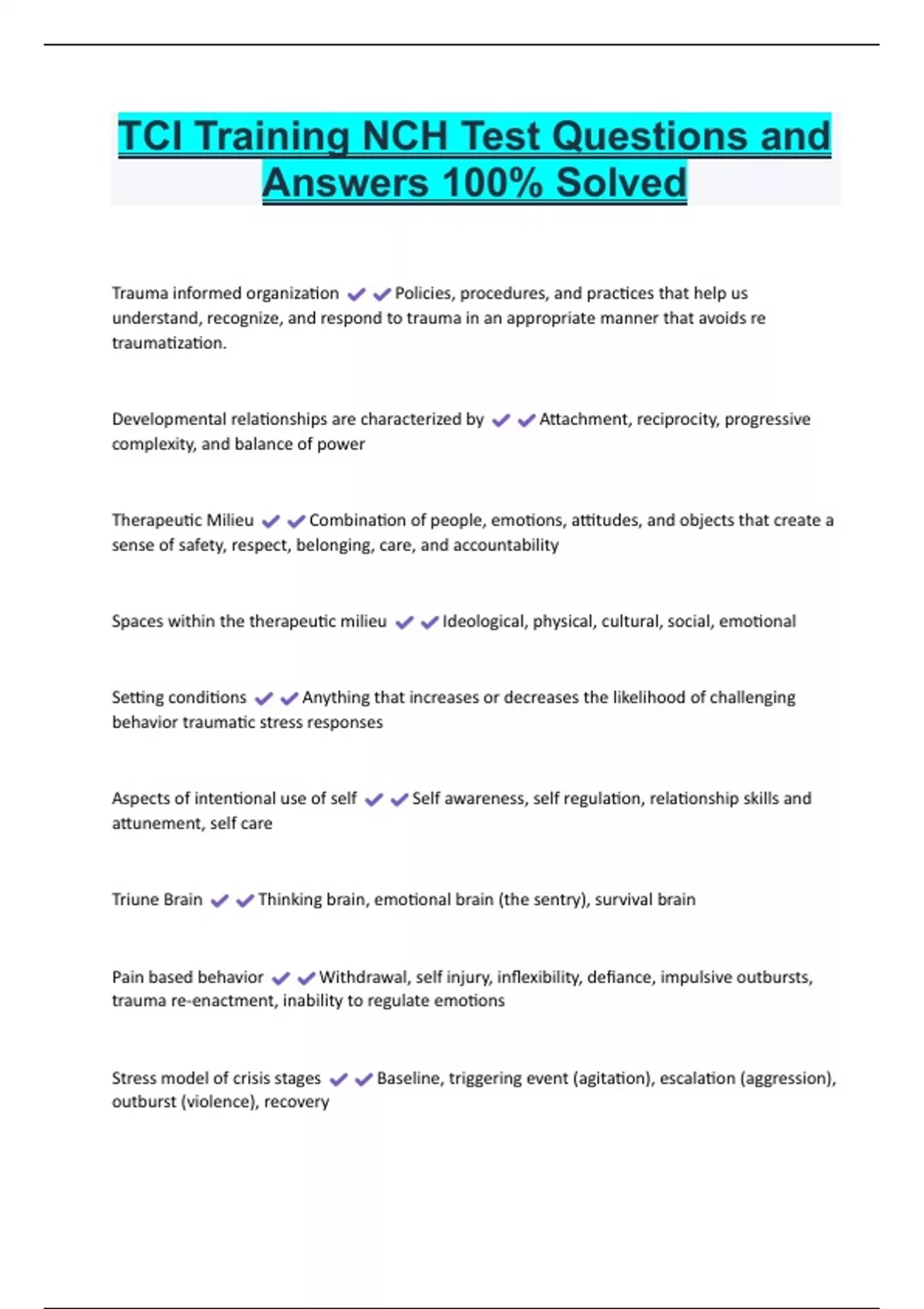 TCI Training NCH Test Questions and Answers 100% Solved Trauma informed organization Policies, procedures, and practices that help us understand, recognize, and respond to trauma in an appropriate manner that avoids re traumatization. Developmental relationships are characterized by Attachment, reciprocity, progressive complexity, and balance of power Therapeutic Milieu Combination of people, emotions, attitudes, and objects that create a sense of safety, respect, belonging, care, and accountability Spaces within the therapeutic milieu Ideological, physical, cultural, social, emotional Setting conditions Anything that increases or decreases the likelihood of challenging behavior traumatic stress responses Aspects of intentional use of self Self awareness, self regulation, relationship skills and attunement, self car