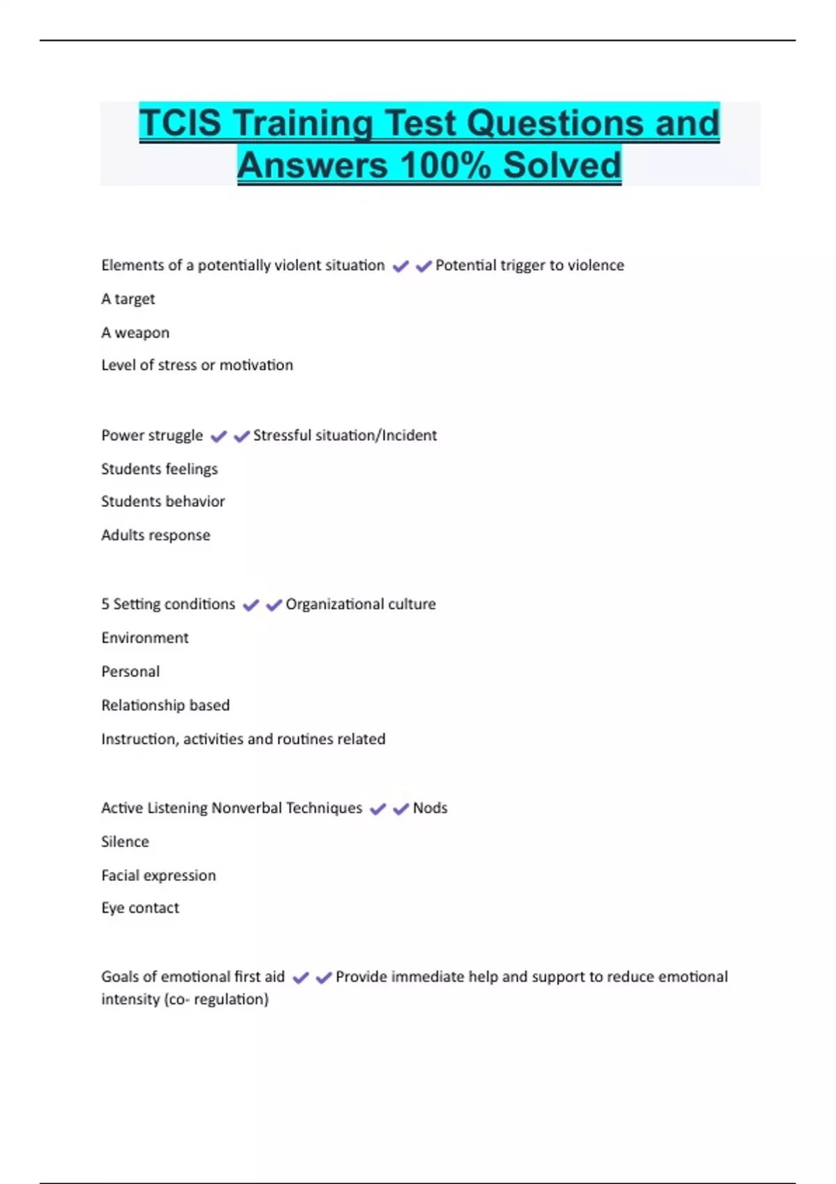 TCIS Training Test Questions and Answers 100% Solved Elements of a potentially violent situation Potential trigger to violence A target A weapon Level of stress or motivation Power struggle Stressful situation/Incident Students feelings Students behavior Adults response 5 Setting conditions Organizational culture Environment Personal Relationship based Instruction, activities and routines related