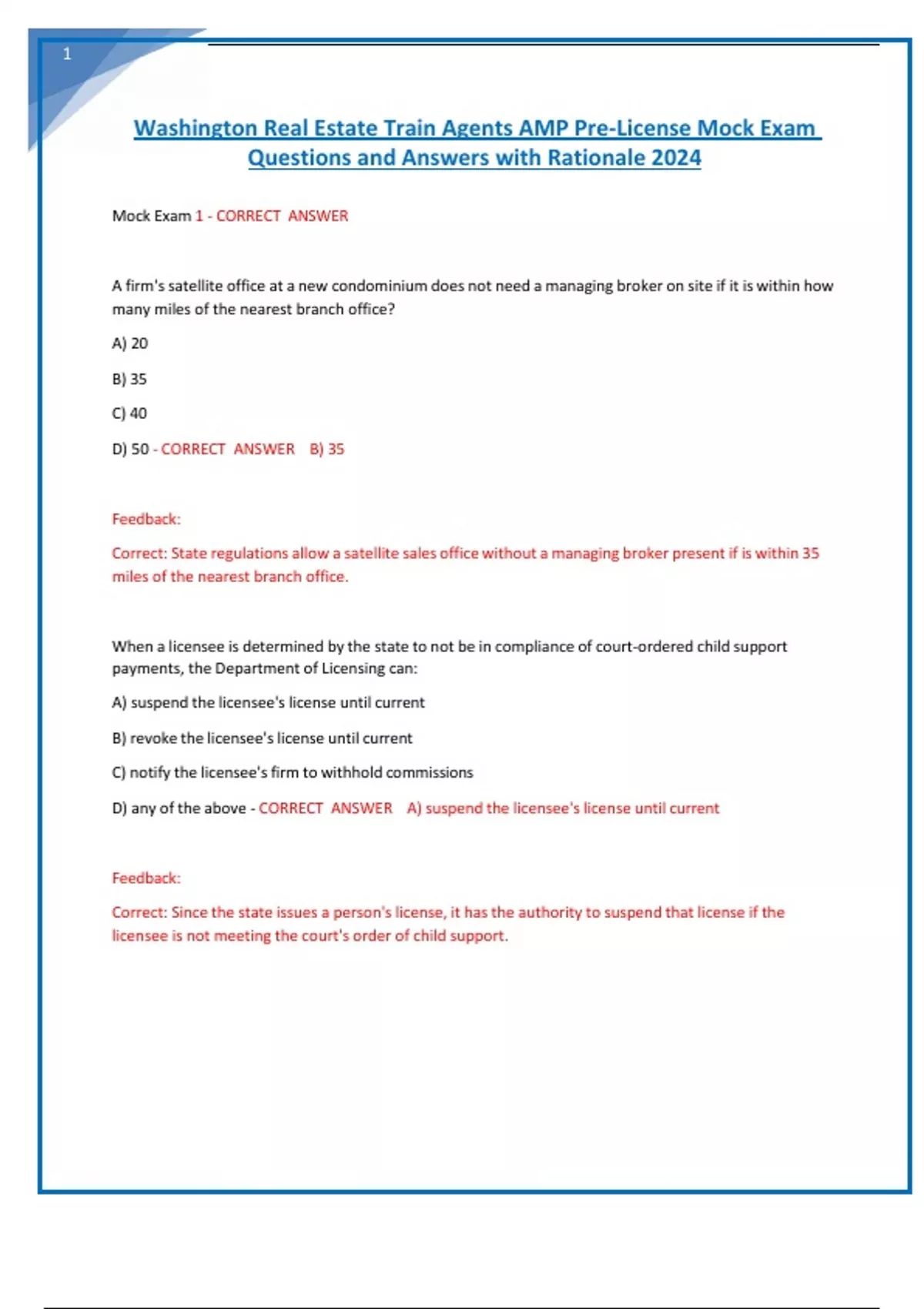 Washington Real Estate Train Agents AMP Pre-License Mock Exam Questions and Answers with Rationale 2024