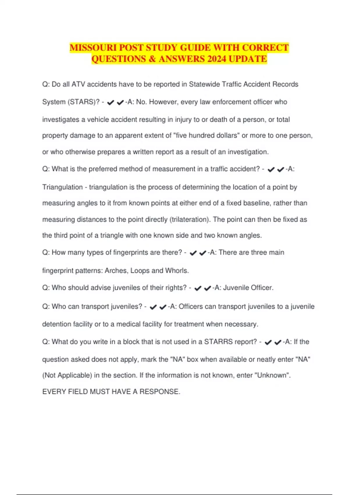 MISSOURI POST STUDY GUIDE WITH CORRECT QUESTIONS & ANSWERS 2024 UPDATE Q: Do all ATV accidents have to be reported in Statewide Traffic Accident Records System (STARS)? - ️️ -A: No. However, every law enforcement officer who investigates a vehicle accident resulting in injury to or death of a person, or total property damage to an apparent extent of "five hundred dollars" or more to one person, or who otherwise prepares a written report as a result of an investigation. Q: What is the preferred method of measurement in a traffic accident? - ️️ -A: Triangulation - triangulation is the process of determining the location of a point by measuring angles to it from known points at either end of a fixed baseline, rather than measuring distances to the point directly (trilateration). The point can then be fixed as the third point of a triangle with one known side and two known angles. Q: How many types of fingerprints are there? - ️️ -A: There are three main fingerprint patterns: Arches, Loops and Whorls. Q: Who should advise juveniles of their rights? - ️️ -A: Juvenile Officer. Q: Who can transport juveniles? - ️️ -A: Officers can transport juveniles to a juvenile detention facility or to a medical facility for treatment when necessary. Q: What do you write in a block that is not used in a STARRS report? - ️️ -A: If the question asked does not apply, mark the "NA" box when available or neatly enter "NA" (Not Applicable) in the section. If the information is not known, enter "Unknown". EVERY FIELD MUST HAVE A RESPONSE. Q: How is the date/time written in a STARS report (ex. MM-DD-YYY)? - ️️ -A: Example: January 3, 2000 should be