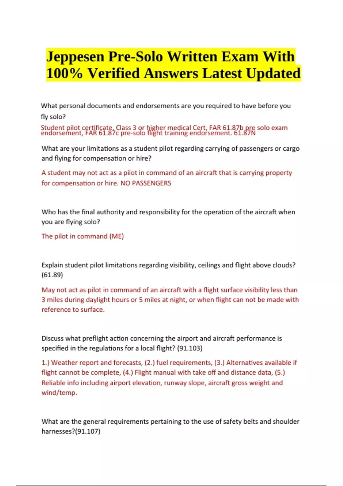 Jeppesen Pre-Solo Written Exam With 100% Verified Answers Latest Updated 2024/2025. What personal documents and endorsements are you required to have before you fly solo? Student pilot certificate, Class 3 or higher medical Cert, FAR 61.87b pre solo exam endorsement, FAR 61.87c pre-solo flight training endorsement. 61.87N What are your limitations as a student pilot regarding carrying of passengers or cargo and flying for compensation or hire? A student may not act as a pilot in command of an aircraft that is carrying property for compensation or hire. NO PASSENGERS Who has the final authority and responsibility for the operation of the aircraft when you are flying solo? The pilot in command (ME) Explain student pilot limitations regarding visibility, ceilings and flight above clouds? (61.89) May not act as pilot in command of an aircraft with a flight surface visibility less than 3 miles during daylight hours or 5 miles at night, or when flight can not be made with reference to surface. Discuss what preflight action concerning the airport and aircraft performance is specified in the regulations for a local flight? (91.103) 1.) Weather report and forecasts, (2.) fuel requirements, (3.) Alternatives available if flight cannot be complete, (4.) Flight manual with take off and distance data, (5.) Reliable info including airport elevation, runway slope, aircraft gross weight and wind/temp. What are the general requirements pertaining to the use of safety belts and shoulder harnesses?(91.107) Jeppesen Pre-Solo Written Exam With 100% Verified Answers Latest Updated The pilot in command must make sure all passengers know how to use seat belts properly. Pilot must use safety belt at all times. Shoulder harness is required only during take off and landings. What is the minimum fuel reserve for day VFR flight and on what cruise speed is the fuel reserve based?(91.151) Enough fuel to fly to the first point of intended landing, assuming normal flight speed. Day- at least 30 mins, Night- at least 45 mins What aircraft certificates and documents must be on board when you are flying solo? (ARROW) 1) Air worthiness cert. (2) Registration (3) Operation handbook (4) Weight and balance info Discuss the right of way rules regarding overtaking another aircraft, approaching head on and another aircraft converging from the side (91.113) Overtaking- veer to the right Approaching head on- each alter course to right Converging- aircraft to the right has the right of way Who has the right of way when two aircrafts are on final approach to land at the same time?(91.113) The airplane at the lower altitude. Don't take advantage of the rule. Discuss the regulations regarding the consumption of alcohol and operating an aircraft (91.17) - Within 8 hours after consuming any alcohol - While having an alcohol concentration of .04 or greater - While under the influence of alcohol At and around your home airport, where is an operating mode C transponder required?(91) - Above the ceiling and within lateral boundaries of class B and C airspace - Above 10,000 feet If your aircraft has an operating mode c transponder, when is it required to be turned on?(91) Within class A, Class B, and class C air space, within 30 miles of class B airport above class B and C airspace, up to 10,000 feet and all airspace above 10,000, and all other controlled airspace Except when necessary for takeoffs and landings, what are the minimum safe altitudes when flying over congested and other than congested areas?(91.119) Congested- 1000 feet above highest obstacle within 2000ft Other than- 500 feet above the surface List at least three sources for local altimeter setting at an airport and another alternative if none is available? (AIM) 1.) AWOS 2.) METAR- once an hour report in text form