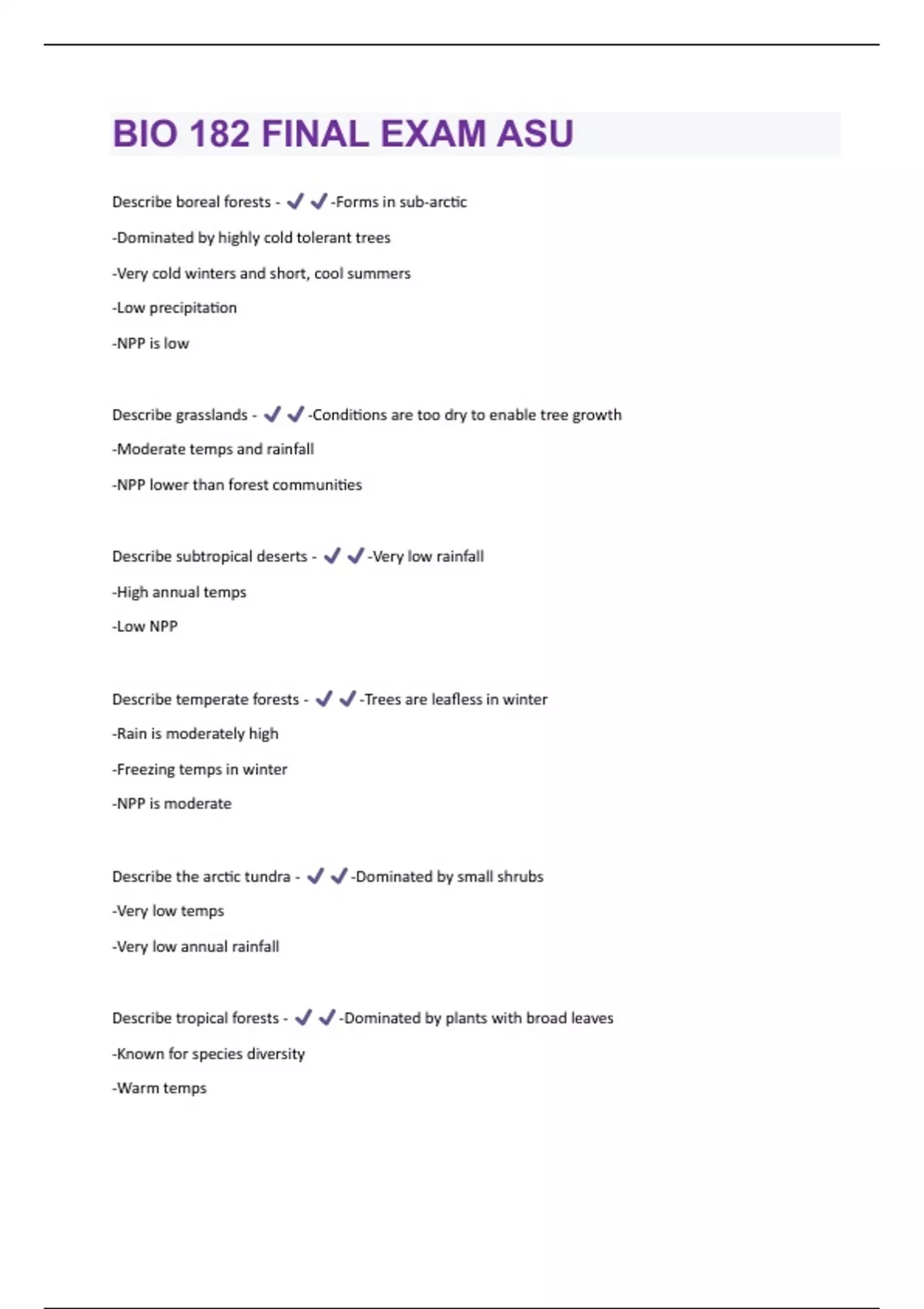 Describe boreal forests - -Forms in sub-arctic -Dominated by highly cold tolerant trees -Very cold winters and short, cool summers -Low precipitation -NPP is low Describe grasslands - -Conditions are too dry to enable tree growth -Moderate temps and rainfall -NPP lower than forest communities Describe subtropical deserts - -Very low rainfall -High annual temps -Low NPP Describe temperate forests - -Trees are leafless in winter -Rain is moderately high -Freezing temps in winter -NPP is moderate Describe the arctic tundra - -Dominated by small shrubs -Very low temps -Very low annual rainfall Describe tropical forests - -Dominated by plants with broad leaves -Known for species diversity -Warm temps-High annual rainfall -Highest NPP Environmental impacts of agricultural advancements - -Irrigation causes the depletion of ground water -Fertilizers cause Nitrogen pollution of lakes, oceans and ground water How are mass extinctions detected and how many have been detected? - They're detected geologically, and there have been 5 detected How are temps determined by solar irradiance and the tilt of the Earth? - -Regions at or near the equator receive more sunlight than regions that are close to the poles due to the Earth's tilt -Solar irradiance causes seasons in the Northern and Southern hemispheres How can an exotic species contribute to extinction? - -An introduction of a new species, that could possibly become an invasive species -An exotic species could carry pathogens How does the presence of mountains and large bodies of water create climate conditions? - - Mountain ranges create rain shadows How have humans impacted terrestrial biomes? - -By physically changing the landscape -Farming, logging, & urban development -Indirect effects: pollution, invasive species, climate change How is energy transferred through the food pyramid? - Decomposer -> primary producer -> primary consumer -> secondary consumer -> tertiary consumer