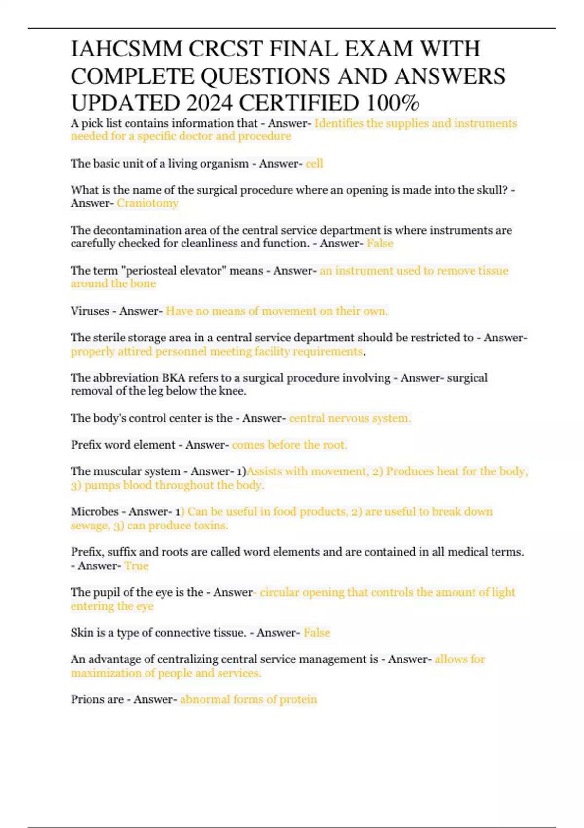 IAHCSMM CRCST FINAL EXAM WITH COMPLETE QUESTIONS AND ANSWERS UPDATED 2024 CERTIFIED 100% A pick list contains information that - Answer- Identifies the supplies and