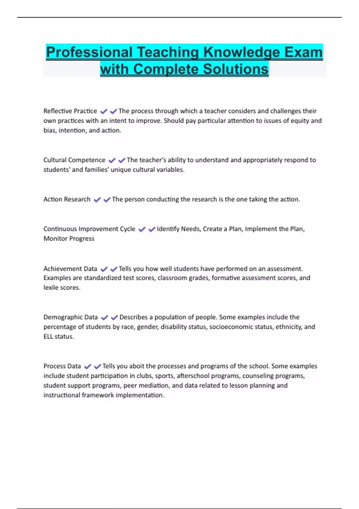 Professional Teaching Knowledge Exam with Complete Solutions Reflective Practice The process through which a teacher considers and challenges their own practices with an intent to improve. Should pay particular attention to issues of equity and bias, intention, and action. Cultural Competence The teacher's ability to understand and appropriately respond to students' and families' unique cultural variables. Action Research The person conducting the research is the one taking the action. Continuous Improvement Cycle Identify Needs, Create a Plan, Implement the Plan, Monitor Progress Achievement Data Tells you how well students have performed on an assessment. Examples are standardized test scores, classroom grades, formative assessment scores, and lexile scores.