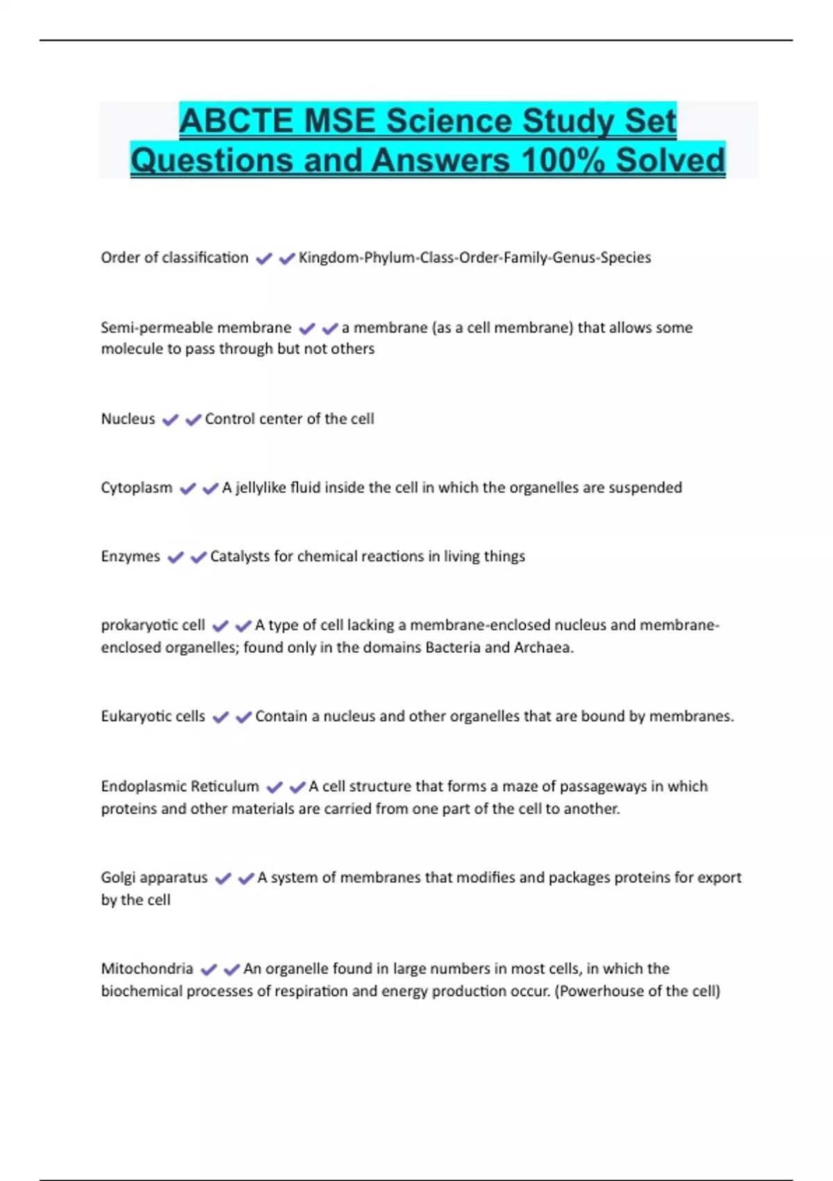 ABCTE MSE Science Study Set Questions and Answers 100% Solved Order of classification Kingdom-Phylum-Class-Order-Family-Genus-Species Semi-permeable membrane a membrane (as a cell membrane) that allows some molecule to pass through but not others Nucleus Control center of the cell Cytoplasm A jellylike fluid inside the cell in which the organelles are suspended Enzymes Catalysts for chemical reactions in living things prokaryotic cell A type of cell lacking a membrane-enclosed nucleus and membraneenclosed organelles; found only in the domains Bacteria and Archaea. Eukaryotic cells Contain a nucleus and other organelles that are bound by membranes. Endoplasmic Reticulum A cell structure that forms a maze of passageways in which proteins and other materials are carried from one part of the cell to another