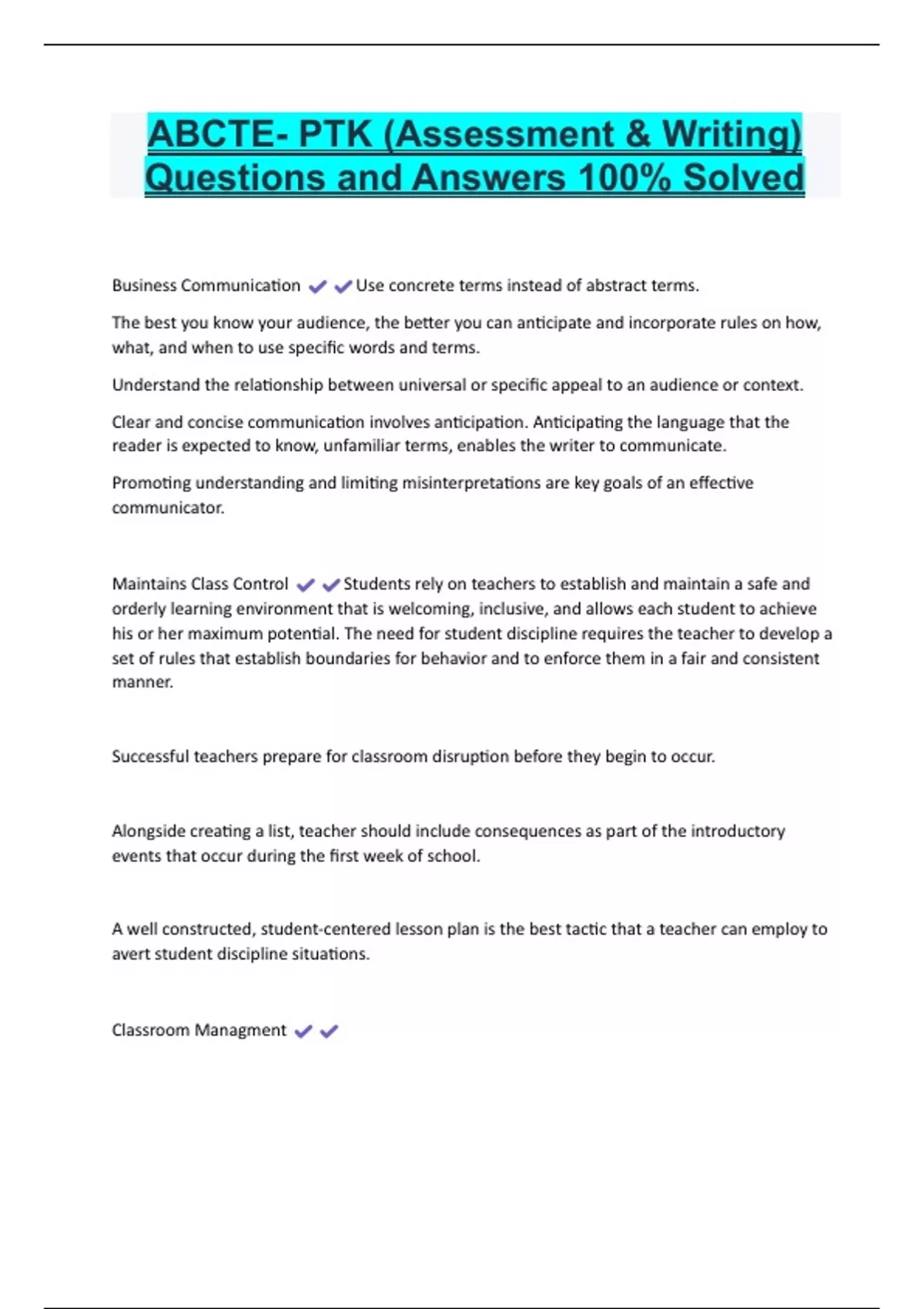 ABCTE- PTK (Assessment & Writing) Questions and Answers 100% Solved Business Communication Use concrete terms instead of abstract terms. The best you know your audience, the better you can anticipate and incorporate rules on how, what, and when to use specific words and terms. Understand the relationship between universal or specific appeal to an audience or context. Clear and concise communication involves anticipation. Anticipating the language that the reader is expected to know, unfamiliar terms, enables the writer to communicate. Promoting understanding and limiting misinterpretations are key goals of an effective communicator. Maintains Class Control Students rely on teachers to establish and maintain a safe and orderly learning environment that is welcoming, inclusive, and allows each student to achieve his or her maximum potential. The need for student discipline requires the teacher to develop a set of rules that establish boundaries for behavior and to enforce them in a fair and consistent
