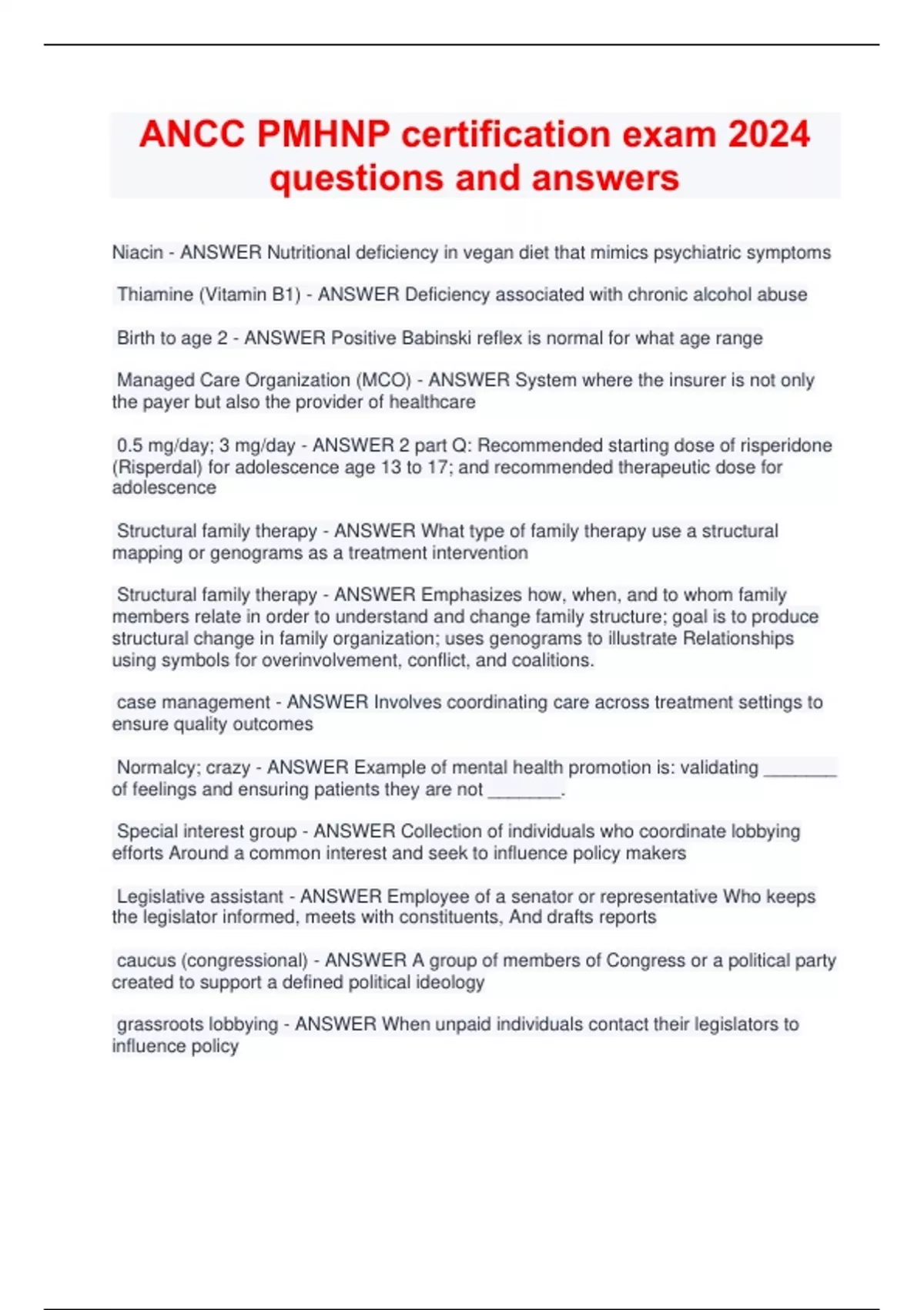 ANCC PMHNP certification exam 2024 questions and answers Niacin - ANSWER Nutritional deficiency in vegan diet that mimics psychiatric symptoms Thiamine (Vitamin B1) - ANSWER Deficiency associated with chronic alcohol abuse Birth to age 2 - ANSWER Positive Babinski reflex is normal for what age range Managed Care Organization (MCO) - ANSWER System where the insurer is not only the payer but also the provider of healthcare 0.5 mg/day; 3 mg/day - ANSWER 2 part Q: Recommended starting dose of risperidone (Risperdal) for adolescence age 13 to 17; and recommended therapeutic dose for adolescence Structural family therapy - ANSWER What type of family therapy use a structural mapping or genograms as a treatment intervention Structural family therapy - ANSWER Emphasizes how, when, and to whom family members relate in order to understand and change family structure; goal is to produce structural change in family organization; uses genograms to illustrate Relationships using symbols for overinvolvement, conflict, and coalitions. case management - ANSWER Involves coordinating care across treatment settings to ensure quality outcomes Normalcy; crazy - ANSWER Example of mental health promotion is: validating _______ of feelings and ensuring patients they are not _______. Special interest group - ANSWER Collection of individuals who coordinate lobbying efforts Around a common interest and seek to influence policy makers Legislative assistant - ANSWER Employee of a senator or representative Who keeps the legislator informed, meets with constituents, And drafts reports caucus (congressional) - ANSWER A group of members of Congress or a political party created to support a defined political ideology grassroots lobbying - ANSWER When unpaid individuals contact their legislators to influence policy 14-17 - ANSWER The HAM-A is ranked from 0 (not present) to 4 (severe). What scores indicate mild anxiety? 18-24 - ANSWER The HAM-A is ranked from 0 (not present) to 4 (severe). What scores indicate mild anxiety? 25-30 - ANSWER The HAM-A is ranked from 0 (not present) to 4 (severe). What scores indicate severe anxiety? sensorimotor stage (birth-2 years) - ANSWER Piaget's stages of cognitive development when children develop object permanence (things exist even when they cannot be seen). preoperational stage (2-5 years) - ANSWER Piaget's stages of cognitive development when children tend to be egocentric, think concretely, and develop language and thinking. concrete operational stage (6-11 years) - ANSWER Piaget's stages of cognitive development when children begin using logic or reasoning about concrete events. formal operational stage (11-19 years) - ANSWER Piaget's stages of cognitive development when children begin to think abstractly, reason hypothetically, use deductive logic, Infancy (birth to 2 years) - ANSWER Piaget's sensoriomotor stage of cognitive development when children develop object permanence Early childhood (2-5 years) - ANSWER Piagets preoperational stage Middle childhood (6-11 years) - ANSWER Piagets concrete operational stage Adolescence (11-19 years) - ANSWER Piagets formal operational stage Social phobia - ANSWER Commonly seen in Japan and Korea taijin kyofusho is a form of what mental illness 4-6 weeks - ANSWER Time frame for Celexa to have a therapeutic effect 4-6 weeks, 6-12 months - ANSWER When started on an SSRI may take _____ weeks for effect and should be continued for _____ months to prevent relapse Decrease; increase - ANSWER Thiazide diuretics such as hydrochlorothiazide [increase/decrease?] lithium clearance, thus [increase/decrease?] the amount of lithium in the body t-test - ANSWER inferential statistics that assess whether the means of two groups are statistically different from each other Analysis of variance (ANOVA) - ANSWER inferential statistics that tests the difference among three or more groups Pearson's r correlation - ANSWER inferential statistics that tests the relationship etween two variables probability - ANSWER inferential statistics that shows the likelihood of an event occurring p-value/level of significance - ANSWER inferential statistic that describes the probability of a particular result occurring by chance alone variance - ANSWER any event that alters patient progress toward expected outcomes (practitioner competency, severity of illness) health production function - ANSWER mathematical expression that shows the relationship between an individual's health and a number of other variables, including the amount of health care consumed (multiple choice: health alliance, health economics, health care system, health production function) health care system - ANSWER describes the organizational and institutional structures through which an economy makes choices regarding production, consumption, and distribution of medical services (multiple choice: health alliance, health economics, health care system, health production function) health economics - ANSWER related to the value, effectiveness, and efficiency of care received (multiple choice: health alliance, health economics, health care system, health production function) health alliance - ANSWER public agency that uses its bargaining power to negotiate competitive prices for health insurance from the private insurance market (multiple choice: health alliance, health economics, health care system, health production function) Splitting - ANSWER What defense mechanism is patient using that is causing her to see people as either all good or all evil University of Colorado - ANSWER which school was the site of the first NP program Lower (ex: lithium) - ANSWER A medication with a lower therapeutic index is a [higher/lower?] margin of safety standardized rating measure; screening tool - ANSWER HAM-A,