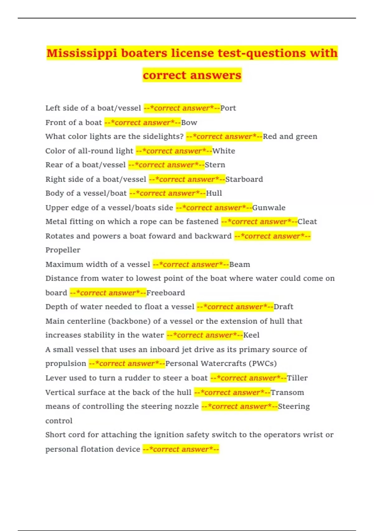 Mississippi boaters license test-questions with correct answers Left side of a boat/vessel --*correct answer*--Port Front of a boat --*correct answer*--Bow What color lights are the sidelights? --*correct answer*--Red and green Color of all-round light --*correct answer*--White Rear of a boat/vessel --*correct answer*--Stern Right side of a boat/vessel --*correct answer*--Starboard