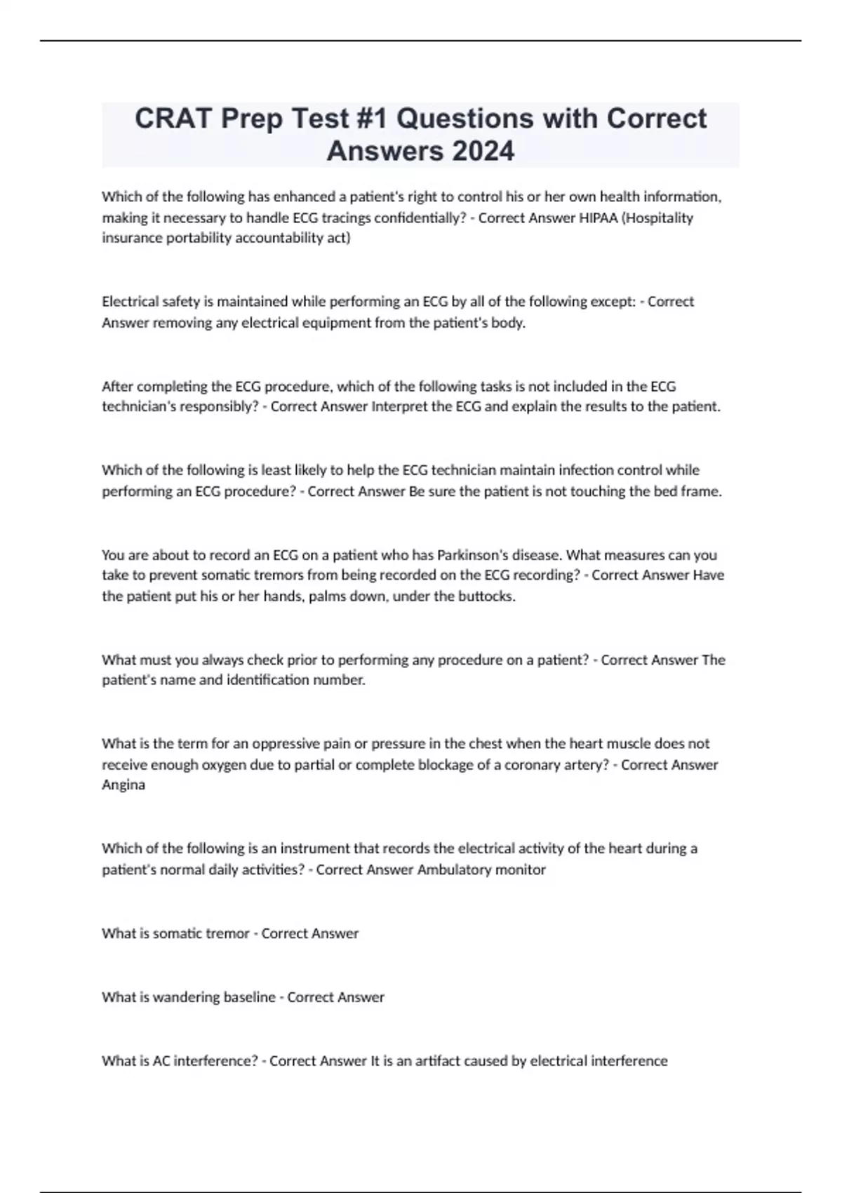 CRAT Prep Test #1 Questions with Correct Answers 2024 Which of the following has enhanced a patient's right to control his or her own health information, making it necessary to handle ECG tracings confidentially? - Correct Answer HIPAA (Hospitality insurance portability accountability act) Electrical safety is maintained while performing an ECG by all of the following except: - Correct Answer removing any electrical equipment from the patient's body. After completing the ECG procedure, which of the following tasks is not included in the ECG technician's responsibly? - Correct Answer Interpret the ECG and explain the results to the patient. Which of the following is least likely to help the ECG technician maintain infection control while performing an ECG procedure? - Correct Answer Be sure the patient is not touching the bed frame. You are about to record an ECG on a patient who has Parkinson's disease. What measures can you take to prevent somatic tremors from being recorded on the ECG recording? - Correct Answer Have the patient put his or her hands, palms down, under the buttocks. What must you always check prior to performing any procedure on a patient? - Correct Answer The patient's name and identification number. What is the term for an oppressive pain or pressure in the chest when the heart muscle does not receive enough oxygen due to partial or complete blockage of a coronary artery? - Correct Answer Angina Which of the following is an instrument that records the electrical activity of the heart during a patient's normal daily activities? - Correct Answer Ambulatory monitor What is somatic tremor - Correct Answer What is wandering baseline - Correct Answer What is AC interference? - Correct Answer It is an artifact caused by electrical interference