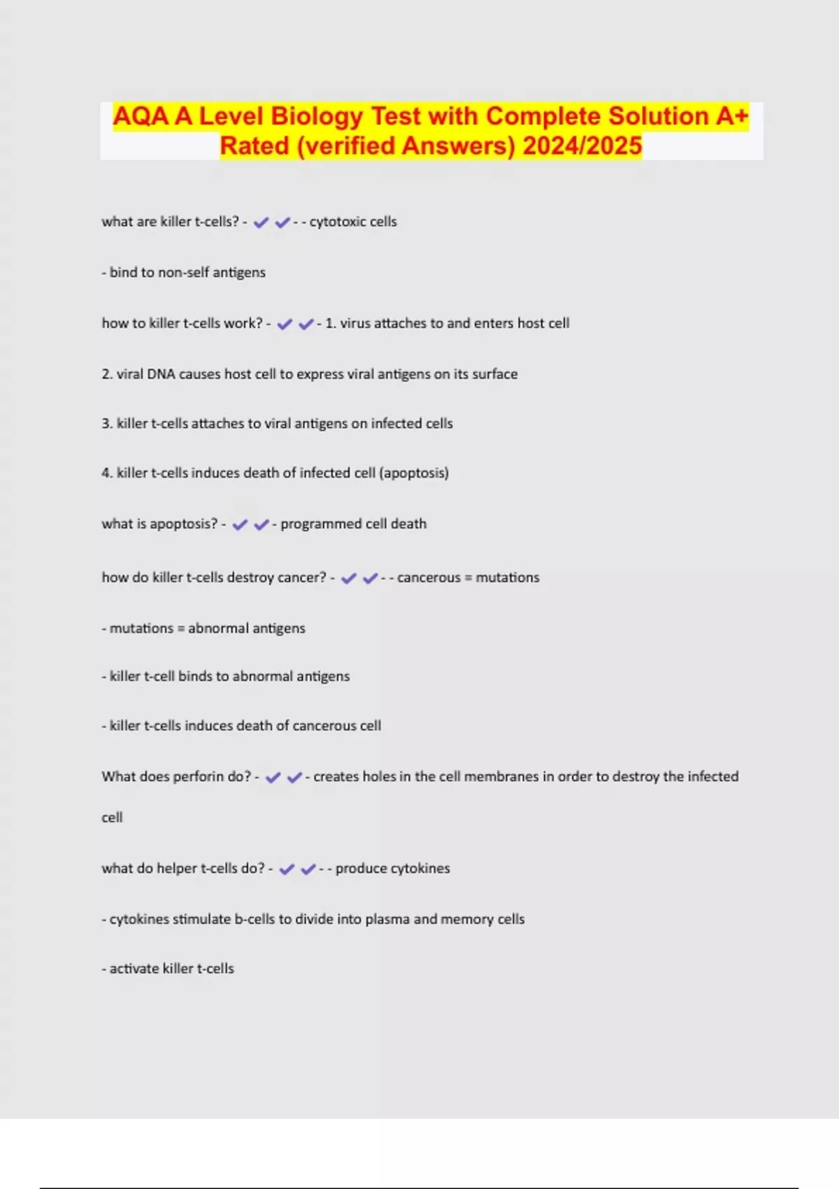 AQA A Level Biology Test with Complete Solution A+ Rated (verified Answers) 2024/2025 what are killer t-cells? - - - cytotoxic cells - bind to non-self antigens how to killer t-cells work? - - 1. virus attaches to and enters host cell 2. viral DNA causes host cell to express viral antigens on its surface 3. killer t-cells attaches to viral antigens on infected cells 4. killer t-cells induces death of infected cell (apoptosis) what is apoptosis? - - programmed cell death how do killer t-cells destroy cancer? - - - cancerous = mutations - mutations = abnormal antigens - killer t-cell binds to abnormal antigens - killer t-cells induces death of cancerous cell What does perforin do? - - creates holes in the cell membranes in order to destroy the infected cell what do helper t-cells do? - - - produce cytokines - cytokines stimulate b-cells to divide into plasma and memory cells - activate killer t-cells define helper t-cells - - help humoral response by involvement in the maturation of b-cells and by triggering the production of antibodies by b-cells what do suppressor t-cells do? - - - halt immune response - prevent wastage of energy and resources - prevent overactive immune response - causes reduction of white blood cells after being ill define memory t-cells - - work in the same way as memory b-cells, ensuring rapid response on subsequent exposure to the same non-self antigens define suppressor t-cells - - regulate the immune response by