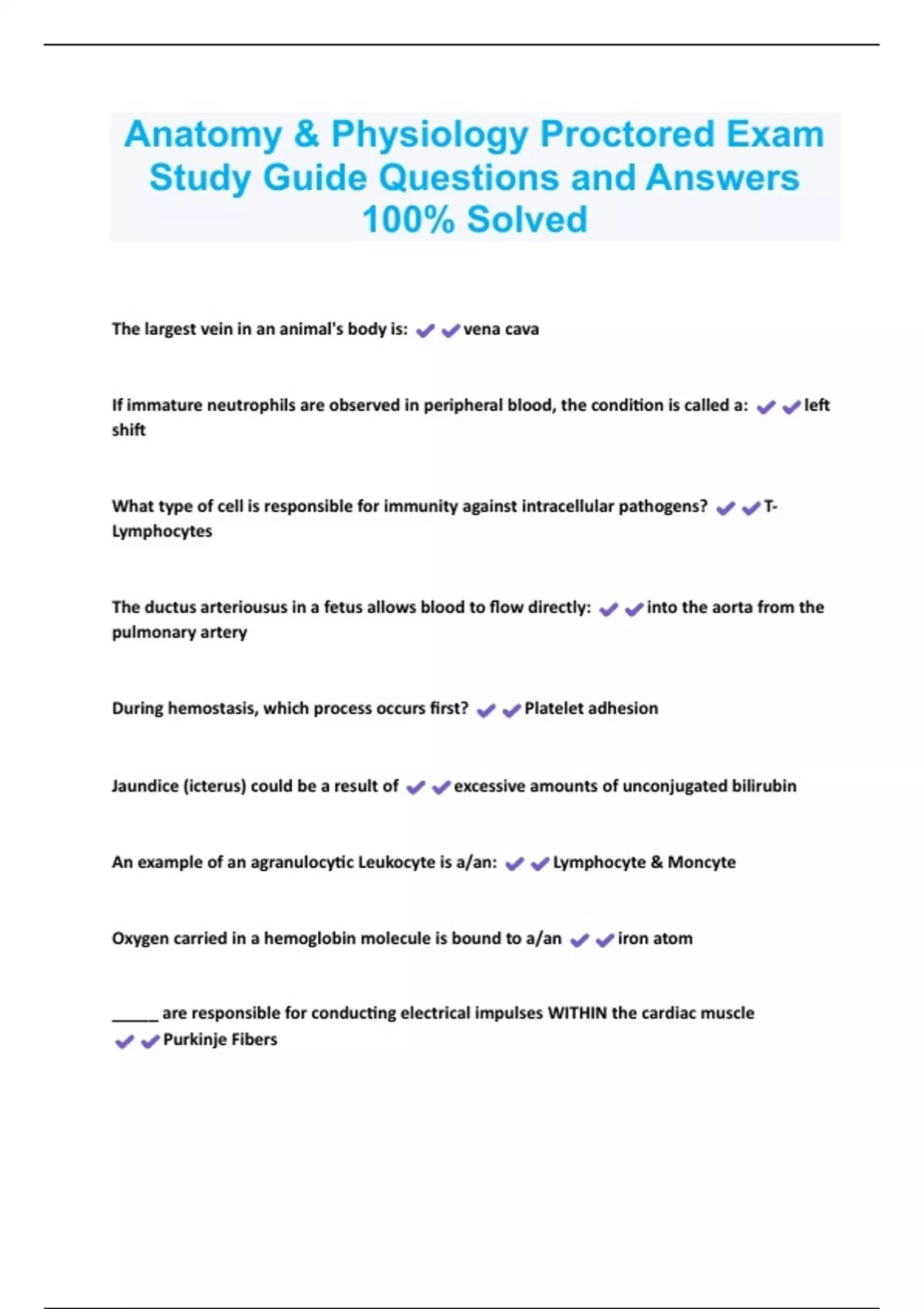 Anatomy & Physiology Proctored Exam Study Guide Questions and Answers 100% Solved The largest vein in an animal's body is: vena cava If immature neutrophils are observed in peripheral blood, the condition is called a: left shift What type of cell is responsible for immunity against intracellular pathogens? TLymphocytes The ductus arteriousus in a fetus allows blood to flow directly: into the aorta from the pulmonary artery During hemostasis, which process occurs first? Platelet adhesion Jaundice (icterus) could be a result of excessive amounts of unconjugated bilirubin An example of an agranulocytic Leukocyte is a/an: Lymphocyte & Moncyte
