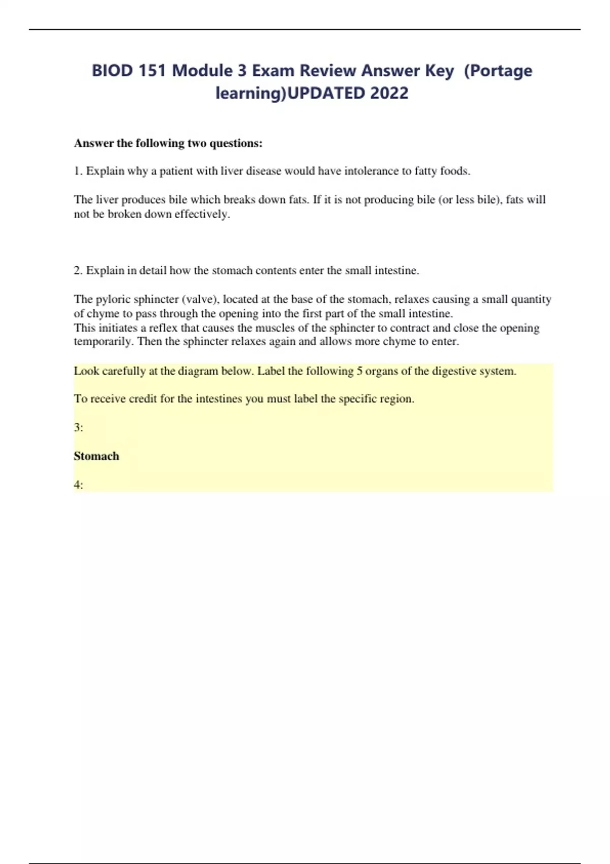 BIOD 151 Module 3 Exam Review Answer Key (Portage learning)UPDATED 2022 Answer the following two questions: 1. Explain why a patient with liver disease would have intolerance to fatty foods. The liver produces bile which breaks down fats. If it is not producing bile (or less bile), fats will not be broken down effectively. 2. Explain in detail how the stomach contents enter the small intestine. The pyloric sphincter (valve), located at the base of the stomach, relaxes causing a small quantity of chyme to pass through the opening into the first part of the small intestine. This initiates a reflex that causes the muscles of the sphincter to contract and close the opening temporarily. Then the sphincter relaxes again and allows more chyme to enter. Look carefully at the diagram below. Label the following 5 organs of the digestive system. To receive credit for the intestines you must label the specific region. 3: Stomach 4: Answer the following two questions: