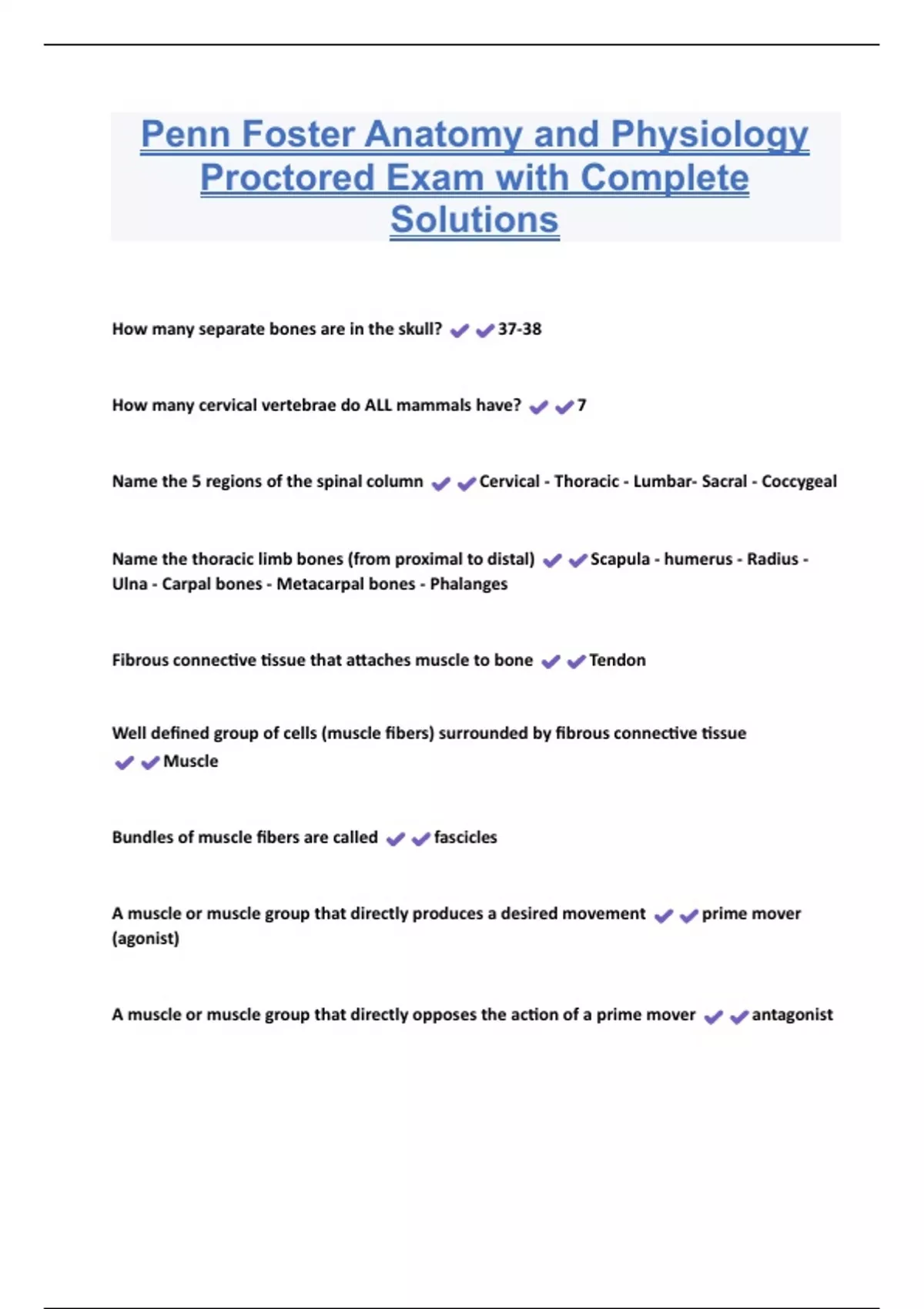 Penn Foster Anatomy and Physiology Proctored Exam with Complete Solutions How many separate bones are in the skull? 37-38 How many cervical vertebrae do ALL mammals have? 7 Name the 5 regions of the spinal column Cervical - Thoracic - Lumbar- Sacral - Coccygeal Name the thoracic limb bones (from proximal to distal) Scapula - humerus - Radius - Ulna - Carpal bones - Metacarpal bones - Phalanges Fibrous connective tissue that attaches muscle to bone Tendon Well defined group of cells (muscle fibers) surrounded by fibrous connective tissue Muscle Bundles of muscle fibers are called fascicles A muscle or muscle group that directly produces a desired movement prime mover (agonist) A muscle or muscle group that directly opposes the action of a prime mover antagoni