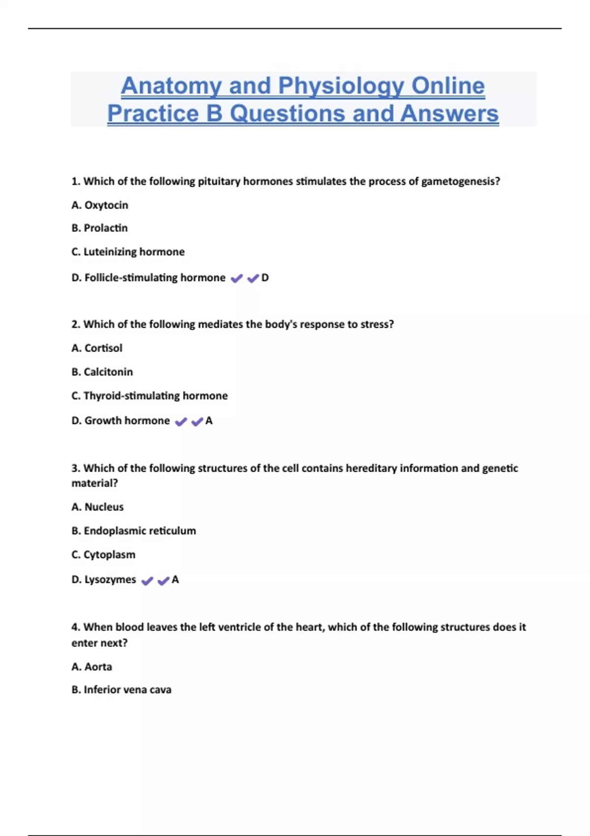Anatomy and Physiology Online Practice B Questions and Answers 1. Which of the following pituitary hormones stimulates the process of gametogenesis? A. Oxytocin B. Prolactin C. Luteinizing hormone D. Follicle-stimulating hormone D 2. Which of the following mediates the body's response to stress? A. Cortisol B. Calcitonin C. Thyroid-stimulating hormone D. Growth hormone A 3. Which of the following structures of the cell contains hereditary information and genetic material? A. Nucleus B. Endoplasmic reticulum C. Cytoplasm D. Lysozymes A
