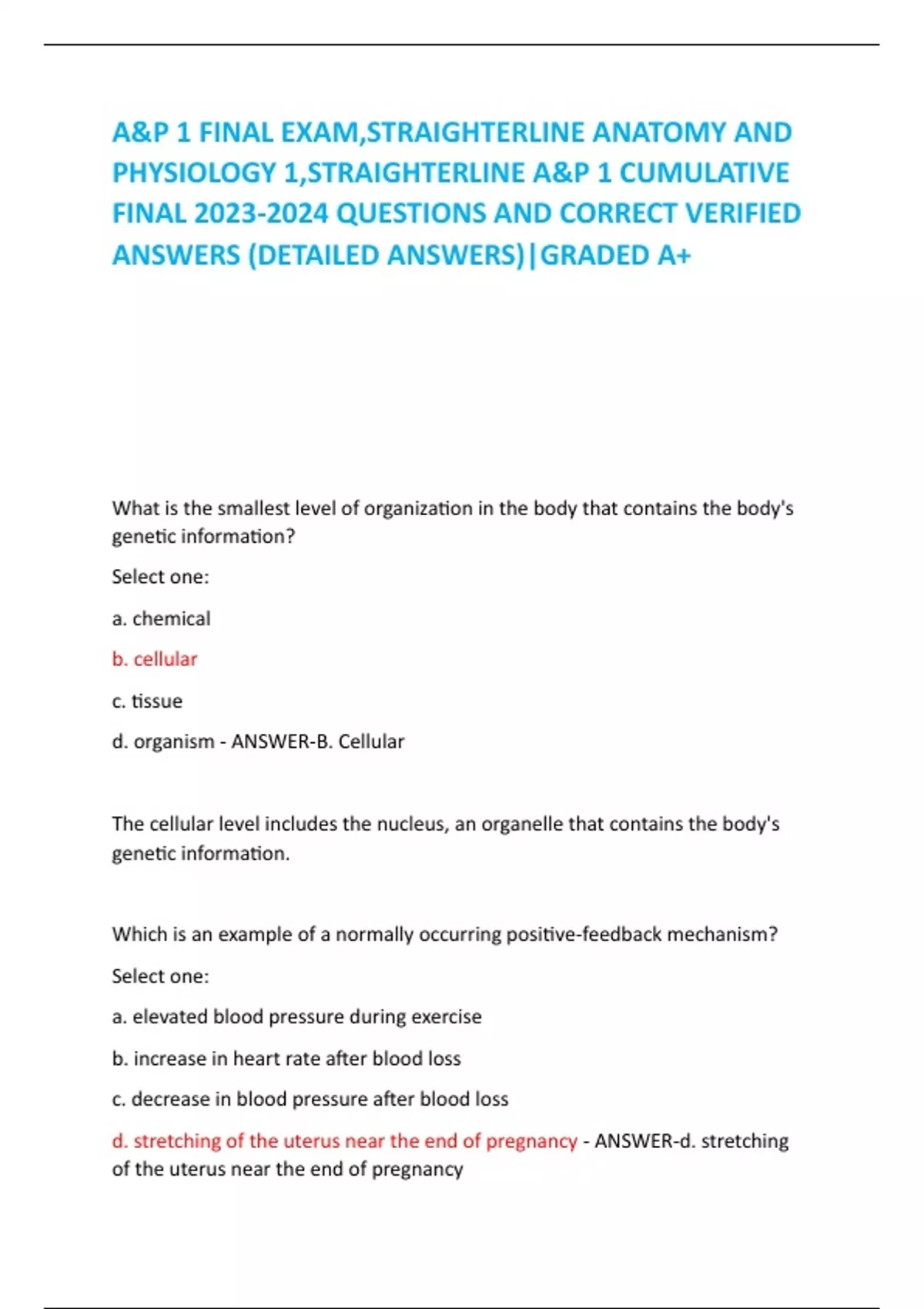 A&P 1 FINAL EXAM,STRAIGHTERLINE ANATOMY AND PHYSIOLOGY 1,STRAIGHTERLINE A&P 1 CUMULATIVE FINAL QUESTIONS AND CORRECT VERIFIED ANSWERS (DETAILED ANSWERS)|GRADED A+