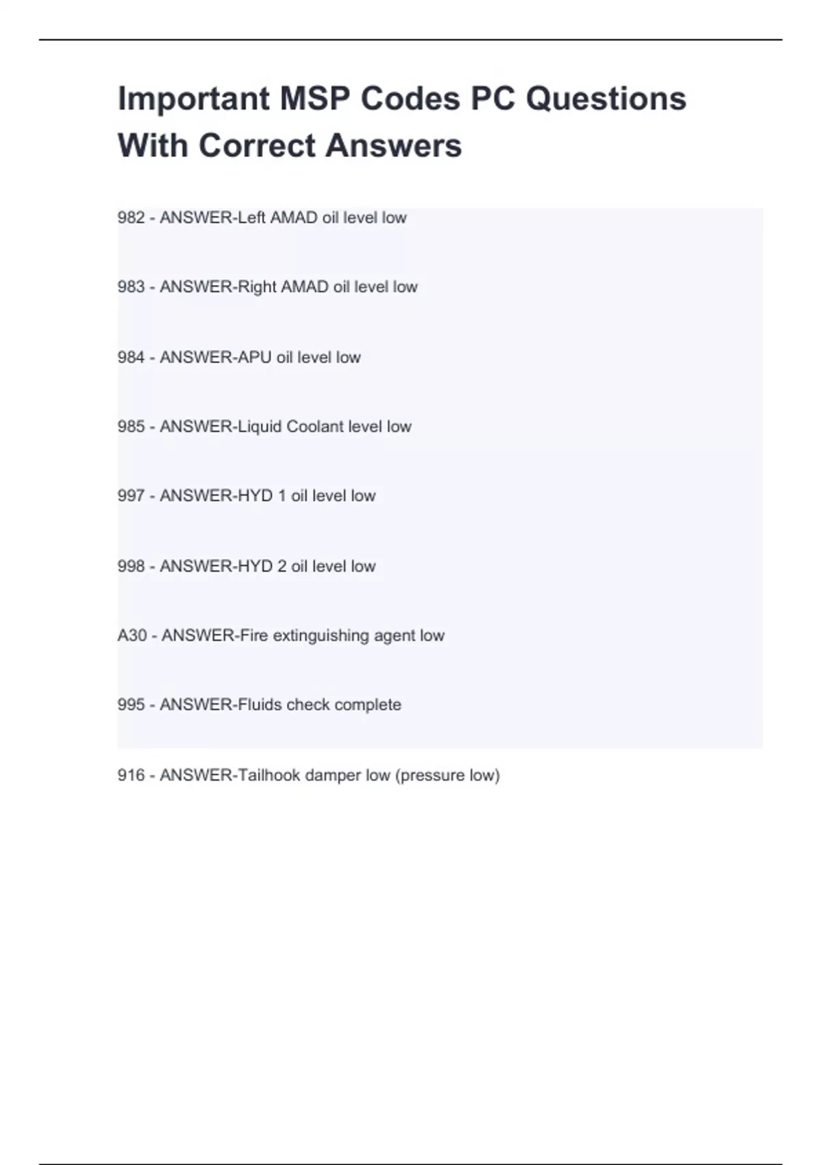 982 - ANSWER-Left AMAD oil level low 983 - ANSWER-Right AMAD oil level low 984 - ANSWER-APU oil level low 985 - ANSWER-Liquid Coolant level low 997 - ANSWER-HYD 1 oil level low 998 - ANSWER-HYD 2 oil level low