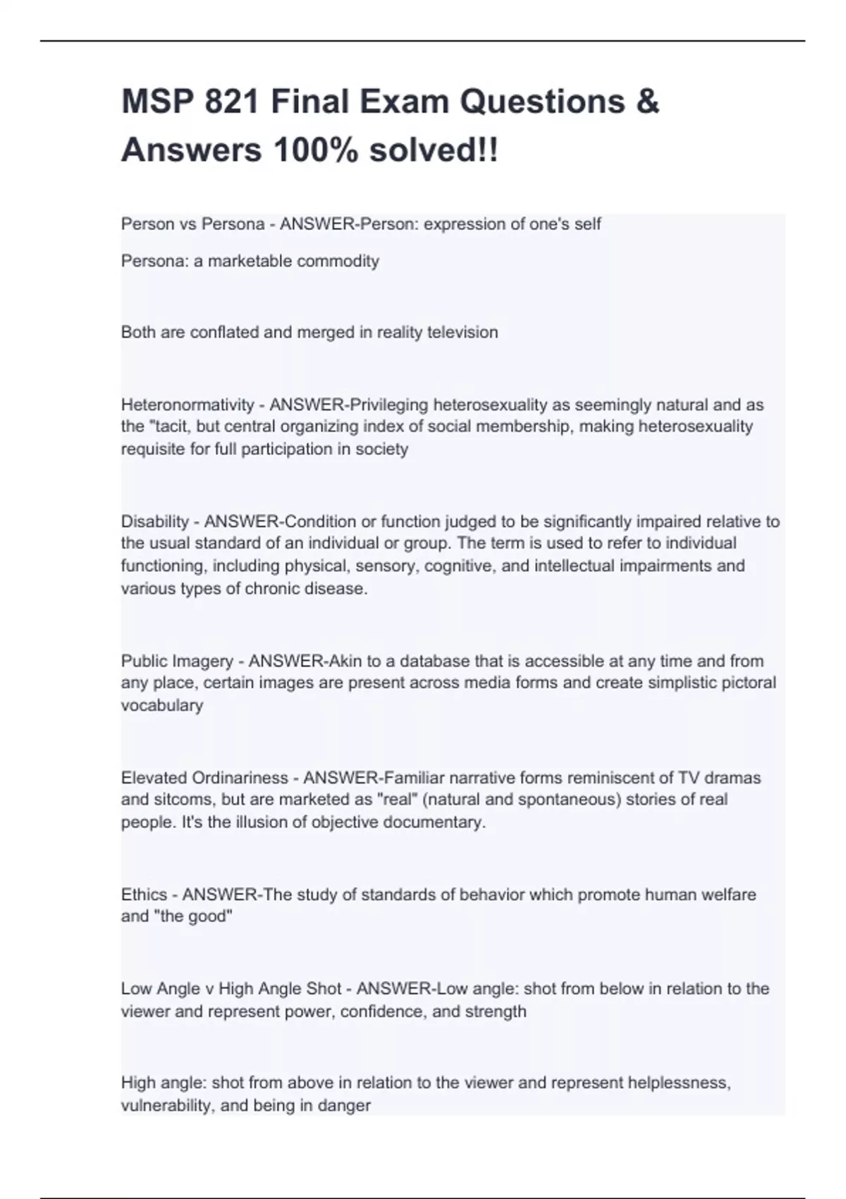 Person vs Persona - ANSWER-Person: expression of one's self Persona: a marketable commodity Both are conflated and merged in reality television Heteronormativity - ANSWER-Privileging heterosexuality as seemingly natural and as the "tacit, but central organizing index of social membership, making heterosexuality requisite for full participation in society Disability - ANSWER-Condition or function judged to be significantly impaired relative to the usual standard of an individual or group. The term is used to refer to individual functioning, including physical, sensory, cognitive, and intellectual impairments and various types of chronic disease. Public Imagery - ANSWER-Akin to a database that is accessible at any time and from any place, certain images are present across media forms and create simplistic pictoral vocabulary Elevated Ordinariness - ANSWER-Familiar narrative forms reminiscent of TV dramas and sitcoms, but are marketed as "real" (natural and spontaneous) stories of real people. It's the illusion of objective documentary. Ethics - ANSWER-The study of standards of behavior which promote human welfare and "the good" Low Angle v High Angle Shot - ANSWER-Low angle: shot from below in relation to the viewer and represent power, confidence, and strength High angle: shot from above in relation to the viewer and represent helplessness, vulnerability, and being in danger