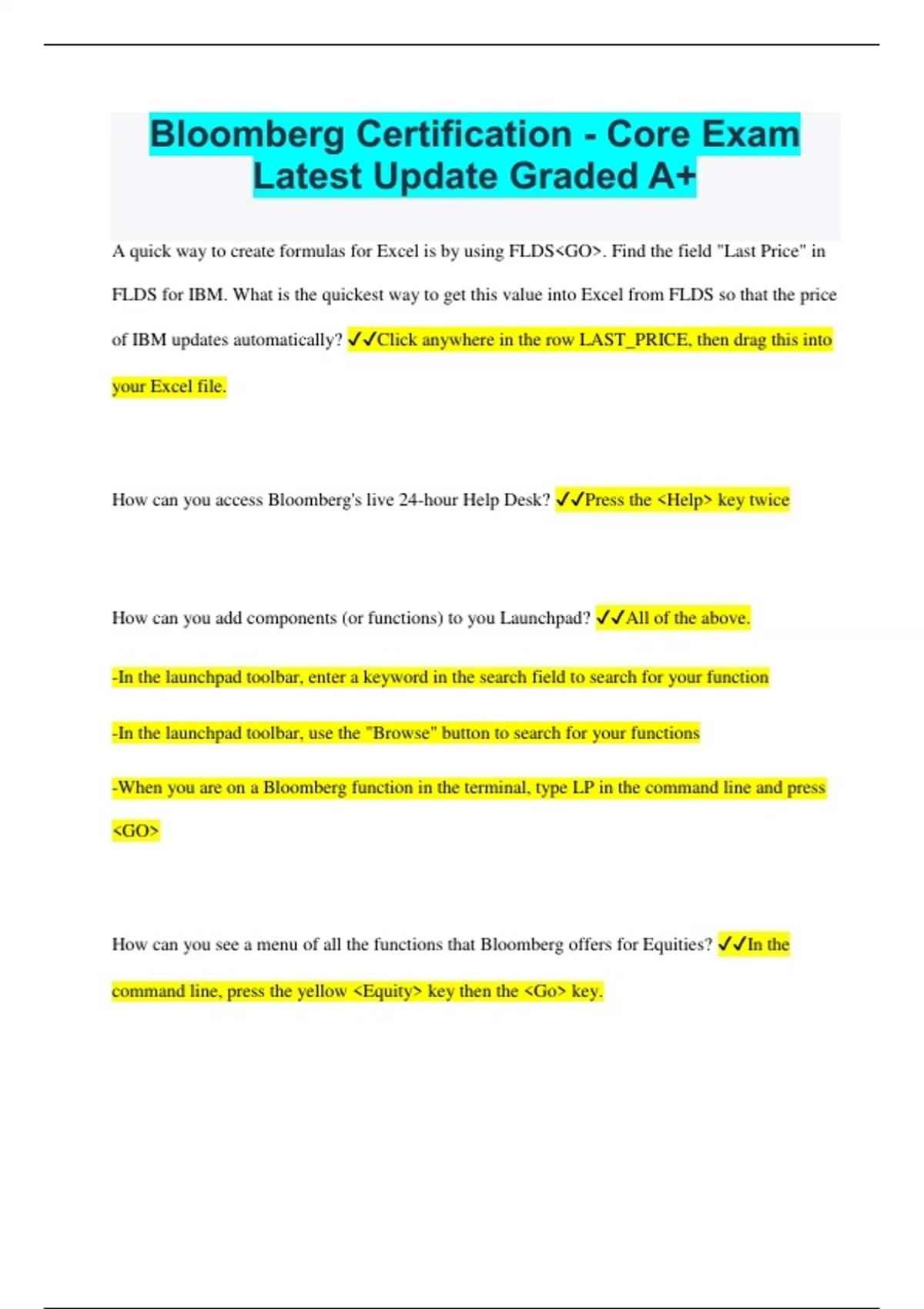 Bloomberg Certification - Core Exam Latest Update Graded A+ A quick way to create formulas for Excel is by using FLDS<GO>. Find the field "Last Price" in FLDS for IBM. What is the quickest way to get this value into Excel from FLDS so that the price of IBM updates automatically? Click anywhere in the row LAST_PRICE, then drag this into your Excel file. How can you access Bloomberg's live 24-hour Help Desk? Press the <Help> key twice How can you add components (or functions) to you Launchpad? All of the above. -In the launchpad toolbar, enter a keyword in the search field to search for your function -In the launchpad toolbar, use the "Browse" button to search for your functions -When you are on a Bloomberg function in the terminal, type LP in the command line and press <GO> How can you see a menu of all the functions that Bloomberg offers for Equities? In the command line, press the yellow <Equity> key then the <Go> key. How can you see real-time news stories, summarized with bulleted highlights for fast reading? FIRS <GO> How can you switch between different Bloomberg windows so that you can multi-task more effectively? <Panel> key If you do not know the ticker for a security you want to analyze, how can you find it? 1 & 3. -In the command line, start typing the first few letters of the company name, do not press <GO>, and select from the drop down list -In the command line, type the name of the security, press <HELP> and then select the appropriate asset class under "securities" on the left hand side If you want news based on the major market sectors you follow, what function can you use? STNI <GO> If you want to analyze the historical performance of a security in a chart, what is the correct order you should use in the command line? Ticker <Asset Class> Function <GO> If you want to explore all the information, functions, and resources available on the topic of "risk" on the Bloomberg, what would you do? In the command line, type RISK and press <Help> In order to start launchpad, which command do you use? BLP <GO> On Launchpad, you can create and organize pages so that they support your workflow. You can also share these pages with other Bloomber users. What option should you select if you want your colleague to be able to update a page you shared with them? In the Launchpad toolbar, click Page>Share Page
