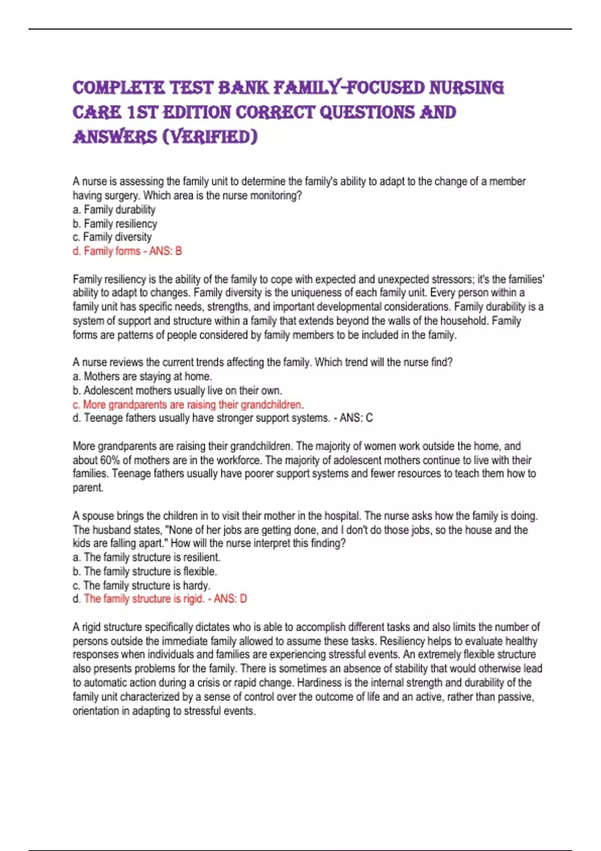 Complete Test Bank Family-Focused Nursing Care 1st Edition correct questions and answers (verified) A nurse is assessing the family unit to determine the family's ability to adapt to the change of a member having surgery. Which area is the nurse monitoring? a. Family durability b. Family resiliency c. Family diversity d. Family forms - ANS: B Family resiliency is the ability of the family to cope with expected and unexpected stressors; it's the families' ability to adapt to changes. Family diversity is the uniqueness of each family unit. Every person within a family unit has specific needs, strengths, and important developmental considerations. Family durability is a system of support and structure within a family that extends beyond the walls of the household. Family forms are patterns of people considered by family members to be included in the family. A nurse reviews the current trends affecting the family. Which trend will the nurse find? a. Mothers are staying at home. b. Adolescent mothers usually live on their own. c. More grandparents are raising their grandchildren. d. Teenage fathers usually have stronger support systems. - ANS: C More grandparents are raising their grandchildren. The majority of women work outside the home, and about 60% of mothers are in the workforce. The majority of adolescent mothers continue to live with their families. Teenage fathers usually have poorer support systems and fewer resources to teach them how to parent. A spouse brings the children in to visit their mother in the hospital. The nurse asks how the family is doing. The husband states, "None of her jobs are getting done, and I don't do those jobs, so the house and the kids are falling apart." How will the nurse interpret this finding? a. The family structure is resilient. b. The family structure is flexible. c. The family structure is hardy. d. The family structure is rigid. - ANS: D