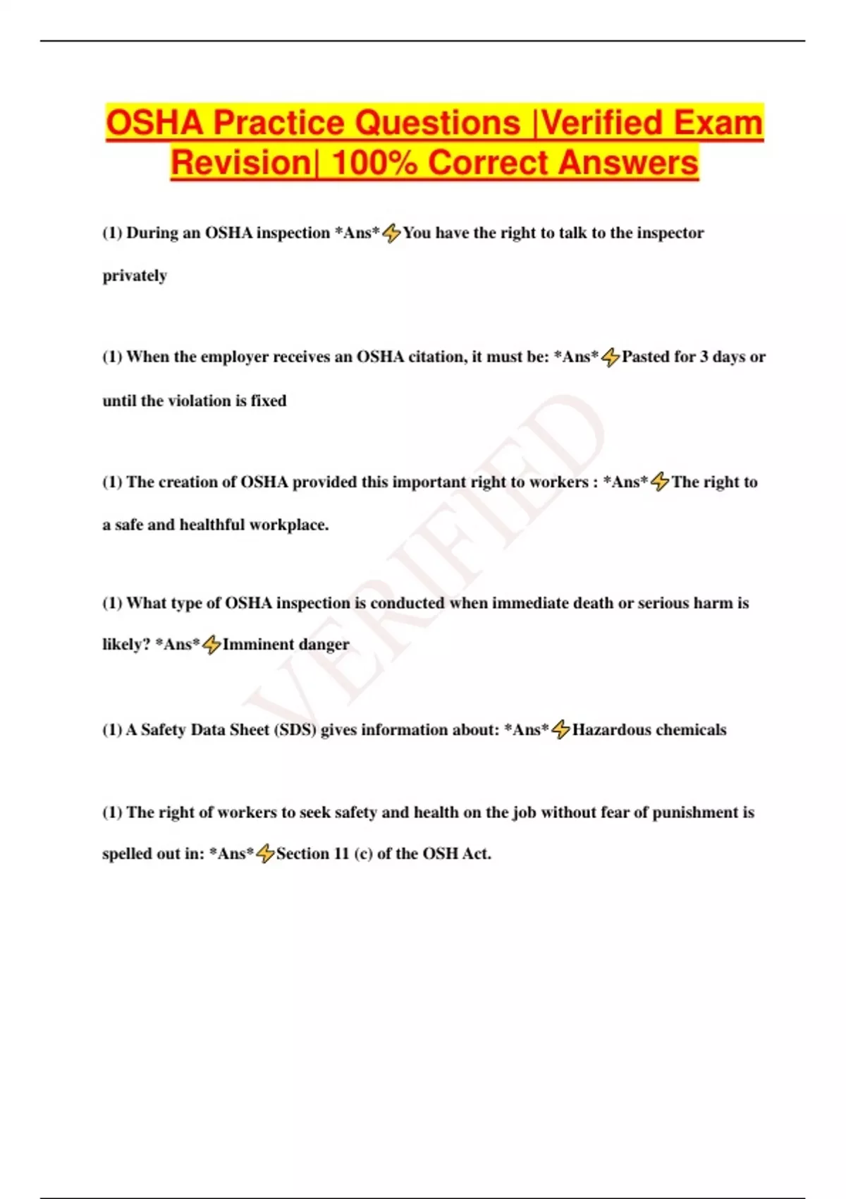 OSHA Practice Questions |Verified Exam Revision| 100% Correct Answers (1) During an OSHA inspection *Ans* You have the right to talk to the inspector privately (1) When the employer receives an OSHA citation, it must be: *Ans* Pasted for 3 days or until the violation is fixed (1) The creation of OSHA provided this important right to workers : *Ans* The right to a safe and healthful workplace. (1) What type of OSHA inspection is conducted when immediate death or serious harm is likely? *Ans* Imminent danger (1) A Safety Data Sheet (SDS) gives information about: *Ans* Hazardous chemicals (1) The right of workers to seek safety and health on the job without fear of punishment is spelled out in: *Ans* Section 11 (c) of the OSH Act. (1) If you fell that an OSHA inspection is needed to get hazards corrected at your workplace, which is your best option? *Ans* Submit a written, signed complaint with specific hazard information. (1) OSHA requires that employers pay for most required personal protective equipment (PPE), including: *Ans* Hard hats (1) The OSHA standards for Construction and General Industry are also known as: *Ans* Part 1926 and Part 1910 (1) Among the right related to OSHA recordkeeping, workers have the right to review: *Ans* The OSHA 300 Log and the OSHA 300A Summary (1) OSHA's mission is to: *Ans* Protect the safety and health of America's workers (1) One of the main responsibilities employers have under OSHA is to: *Ans* Provide training required by OSHA standards. (2) The leading cause of slips, trips, and falls is *Ans* Contaminants on the walking surface (2) According to OSHA, ________ constitute the majority of general industry accidents *Ans* Slips. trips, and falls (2) ___________ is likely to cause you to trip and fall *Ans* Your foot striking an object in an unexpected way (2) Which of the following is not an example of hazard? *Ans* Clean. dry floors surfaces (2) When left on the floor, which of these will create tripping hazards? *Ans* Clutter, Cables, Extension cords, * CORRECT All of the above (2) Age, fatigue, inattentiveness, eyesight, and footwear are ______ that can contribute to slips, trips, and falls. *Ans* Human factors (2) Whenever there is too little friction or traction between your shoes and the floor *Ans* You may slip and fall (2) What should be placed near stairs, changes in elevation, and floor openings to prevent accidents and injuries? *Ans* Visual cues