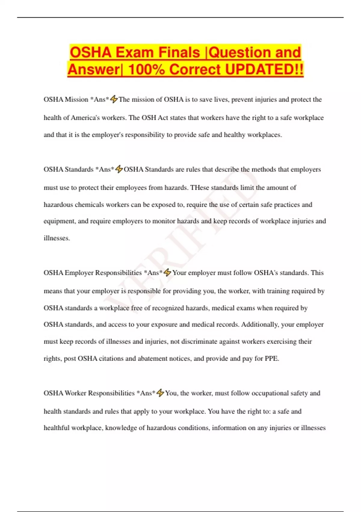 OSHA Exam Finals |Question and Answer| 100% Correct UPDATED!! OSHA Mission *Ans* The mission of OSHA is to save lives, prevent injuries and protect the health of America's workers. The OSH Act states that workers have the right to a safe workplace and that it is the employer's responsibility to provide safe and healthy workplaces. OSHA Standards *Ans* OSHA Standards are rules that describe the methods that employers must use to protect their employees from hazards. THese standards limit the amount of hazardous chemicals workers can be exposed to, require the use of certain safe practices and equipment, and require employers to monitor hazards and keep records of workplace injuries and illnesses. OSHA Employer Responsibilities *Ans* Your employer must follow OSHA's standards. This means that your employer is responsible for providing you, the worker, with training required by OSHA standards a workplace free of recognized hazards, medical exams when required by OSHA standards, and access to your exposure and medical records. Additionally, your employer must keep records of illnesses and injuries, not discriminate against workers exercising their rights, post OSHA citations and abatement notices, and provide and pay for PPE. OSHA Worker Responsibilities *Ans* You, the worker, must follow occupational safety and health standards and rules that apply to your workplace. You have the right to: a safe and healthful workplace, knowledge of hazardous conditions, information on any injuries or illnesses in your workplace, complain or request hazard correction from your employer, training as provided in the OSHA standards, hazard exposure and medical records, the ability to file a complaint with OSHA, participate in an OSHA inspection, and freedom from retaliation for exercising your safety and health rights. OSHA Inspections *Ans* OSHA enforces standards through inspections, prioritizing the most dangerous workplaces. Inspections follow a standard process, consisting of an opening conference, a walkthrough, and a closing conference. Workers have the right to participate in the inspection to point out safety and health issues in the workplace. They also have the right to participate in any meetings related to the inspections and can object to the date set for the violation to be corrected and be notified if their employer files a contest. OSHA Reports and Complaints *Ans* The first action to report a safety hazard should be to contact your team leader, supervisor, manager, safety committee, etc. You may file a report online, in person, by fax or mail, or after a phone conversation. Serious hazards almost always result in a site inspection, as do complaints that are written, signed, and submitted to the OSHA area or State Plan Office. Complaints that are submitted online, over the phone or are not serious hazards will be resolved over the phone. It is recommended that all forms be fully completed and signed. OSHA Whistleblowing *Ans* It is illegal for your employer to use disciplinary, incentive, or drug testing programs to prevent you from reporting any job safety and health hazards. If you have been punished or discriminated against for using your rights, you must file a complaint with OSHA within 30 days of the alleged reprisal for most complaints. OSHA Resources *Ans* There are many resources available to workers who want to find out more information about safety or health issues both inside and outside of their workplace. These include, but are not limited to: safety data sheets (SDSs), labels and warning signs, NIOSH, health care providers, and OSHA. Slips, trips, and falls *Ans* Poor housekeeping creates additional slip and trip hazards. Employers are responsible for maintaining the work area, but you have a responsibility to follow your employer's guidelines. In some cases, the work area has some slip and trip hazards which cannot be removed, and workers must use the correct footwear and be aware of their surroundings in order to remain safe. Employer Fall Protection *Ans* Your employer is responsible for providing working conditions which are free from fall dangers, including keeping floors and work areas in a clean and sanitary condition. Your employer is also required to pr