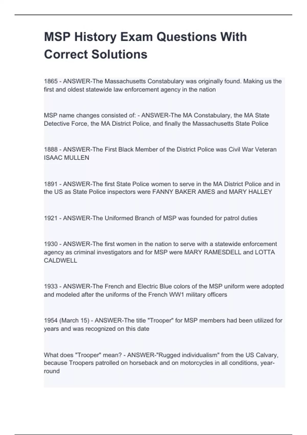 1865 - ANSWER-The Massachusetts Constabulary was originally found. Making us the first and oldest statewide law enforcement agency in the nation MSP name changes consisted of: - ANSWER-The MA Constabulary, the MA State Detective Force, the MA District Police, and finally the Massachusetts State Police 1888 - ANSWER-The First Black Member of the District Police was Civil War Veteran ISAAC MULLEN 1891 - ANSWER-The first State Police women to serve in the MA District Police and in the US as State Police inspectors were FANNY BAKER AMES and MARY HALLEY 1921 - ANSWER-The Uniformed Branch of MSP was founded for patrol duties 1930 - ANSWER-The first women in the nation to serve with a statewide enforcement agency as criminal investigators and for MSP were MARY RAMESDELL and LOTTA CALDWELL 1933 - ANSWER-The French and Electric Blue colors of the MSP uniform were adopted and modeled after the uniforms of the French WW1 military officers 1954 (March 15) - ANSWER-The title "Trooper" for MSP members had been utilized for years and was recognized on this date What does "Trooper" mean? - ANSWER-"Rugged individualism" from the US Calvary, because Troopers patrolled on horseback and on motorcycles in all conditions, year-round