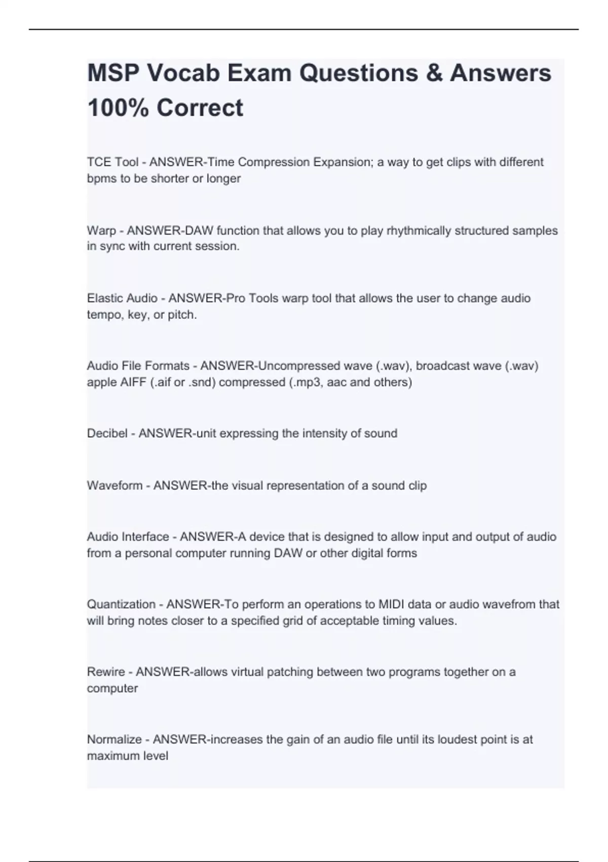 TCE Tool - ANSWER-Time Compression Expansion; a way to get clips with different bpms to be shorter or longer Warp - ANSWER-DAW function that allows you to play rhythmically structured samples in sync with current session. Elastic Audio - ANSWER-Pro Tools warp tool that allows the user to change audio tempo, key, or pitch. Audio File Formats - ANSWER-Uncompressed wave (.wav), broadcast wave (.wav) apple AIFF (.aif or .snd) compressed (.mp3, aac and others) Decibel - ANSWER-unit expressing the intensity of sound Waveform - ANSWER-the visual representation of a sound clip Audio Interface - ANSWER-A device that is designed to allow input and output of audio from a personal computer running DAW or other digital forms Quantization - ANSWER-To perform an operations to MIDI data or audio wavefrom that will bring notes closer to a specified grid of acceptable timing values. Rewire - ANSWER-allows virtual patching between two programs together on a computer Normalize - ANSWER-increases the gain of an audio file until its loudest point is at maximum level