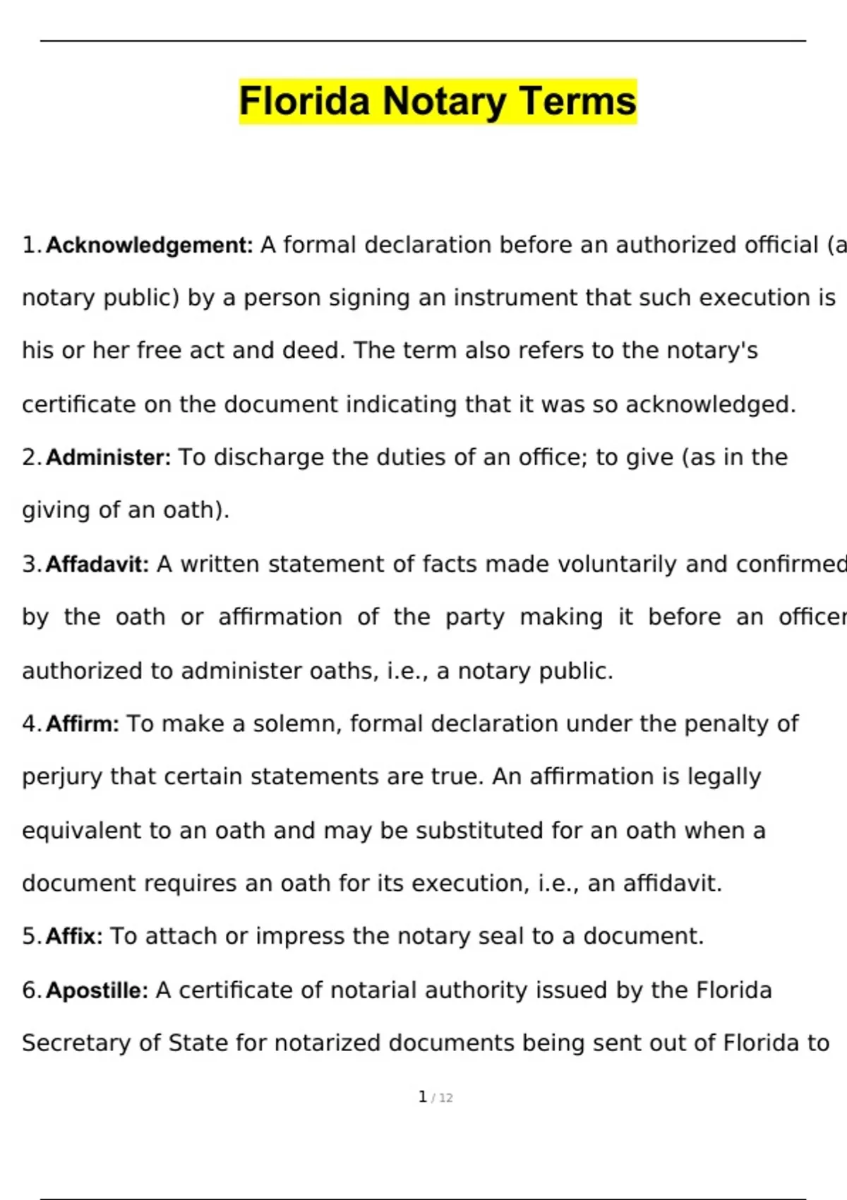 Florida Notary Terms Newest Questions and Answers (Verified Answers)