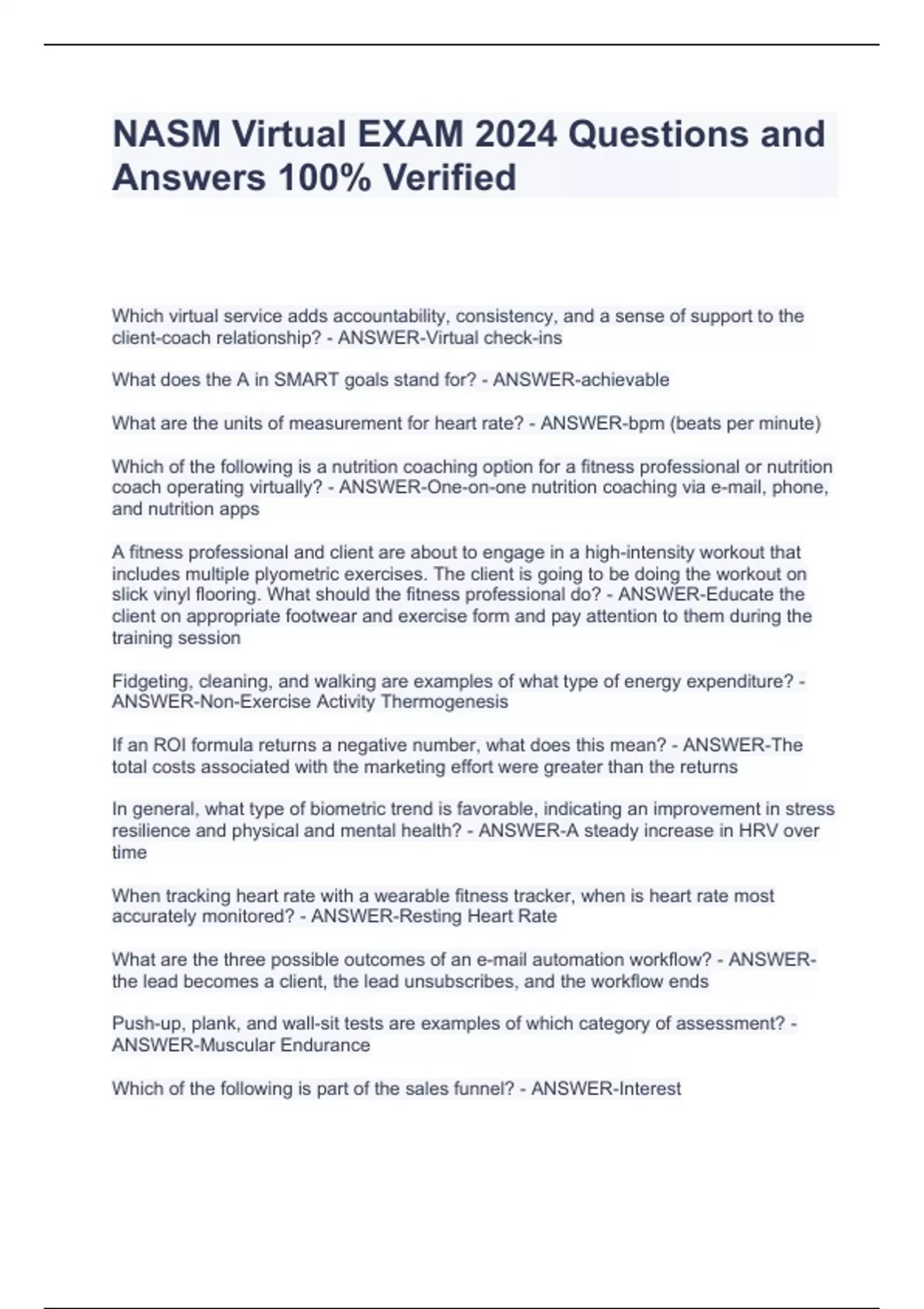 NASM Virtual EXAM 2024 Questions and Answers 100% Verified NASM Virtual EXAM 2024 Questions and Answers 100% Verified NASM Virtual EXAM 2024 Questions and Answers 100% Verified NASM Virtual EXAM 2024 Questions and Answers 100% Verified Which virtual service adds accountability, consistency, and a sense of support to the client-coach relationship? - ANSWER-Virtual check-ins What does the A in SMART goals stand for? - ANSWER-achievable What are the units of measurement for heart rate? - ANSWER-bpm (beats per minute) Which of the following is a nutrition coaching option for a fitness professional or nutrition coach operating virtually? - ANSWER-One-on-one nutrition coaching via e-mail, phone,