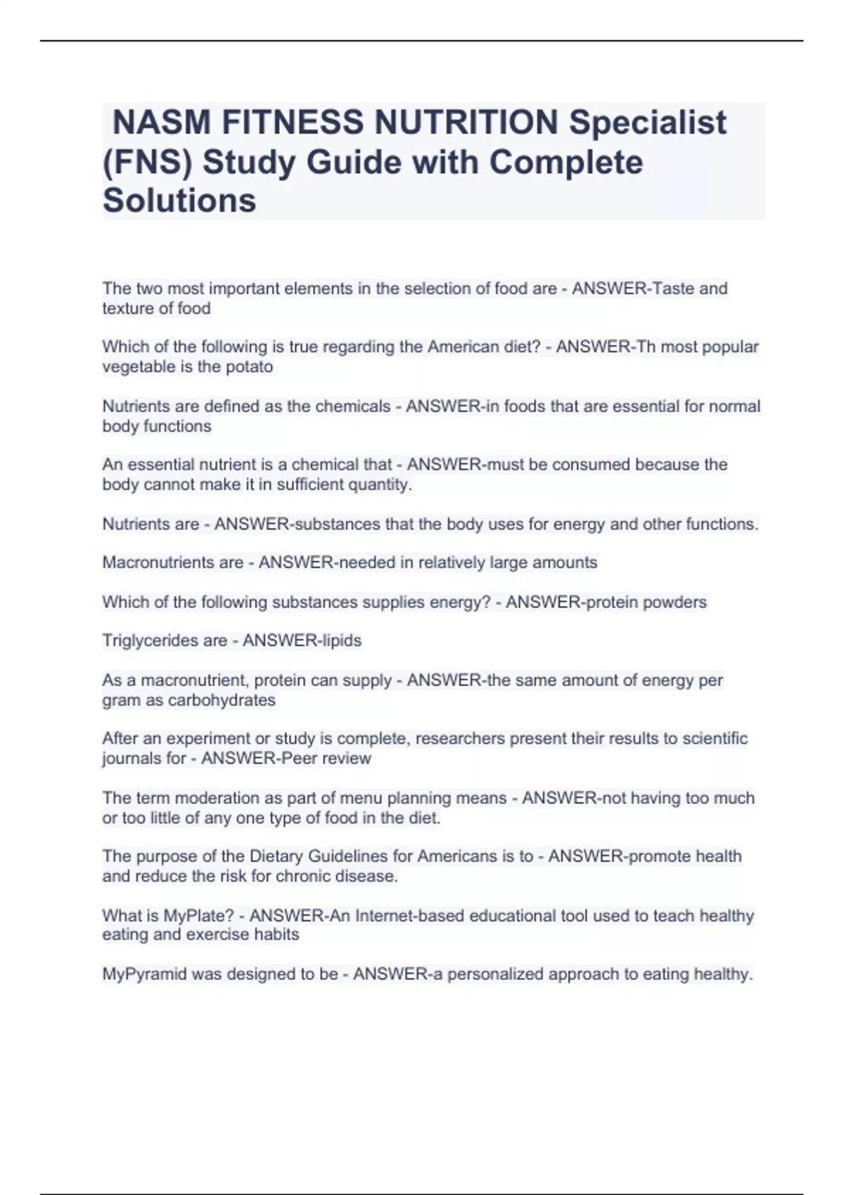 NASM FITNESS NUTRITION Specialist (FNS) Study Guide with Complete SolutionsNASM FITNESS NUTRITION Specialist (FNS) Study Guide with Complete SolutionsNASM FITNESS NUTRITION Specialist (FNS) Study Guide with Complete SolutionsNASM FITNESS NUTRITION Specialist (FNS) Study Guide with Complete Solutions The two most important elements in the selection of food are - ANSWER-Taste and texture of food Which of the following is true regarding the American diet? - ANSWER-Th most popular vegetable is the potato Nutrients are defined as the chemicals - ANSWER-in foods that are essential for normal body functions