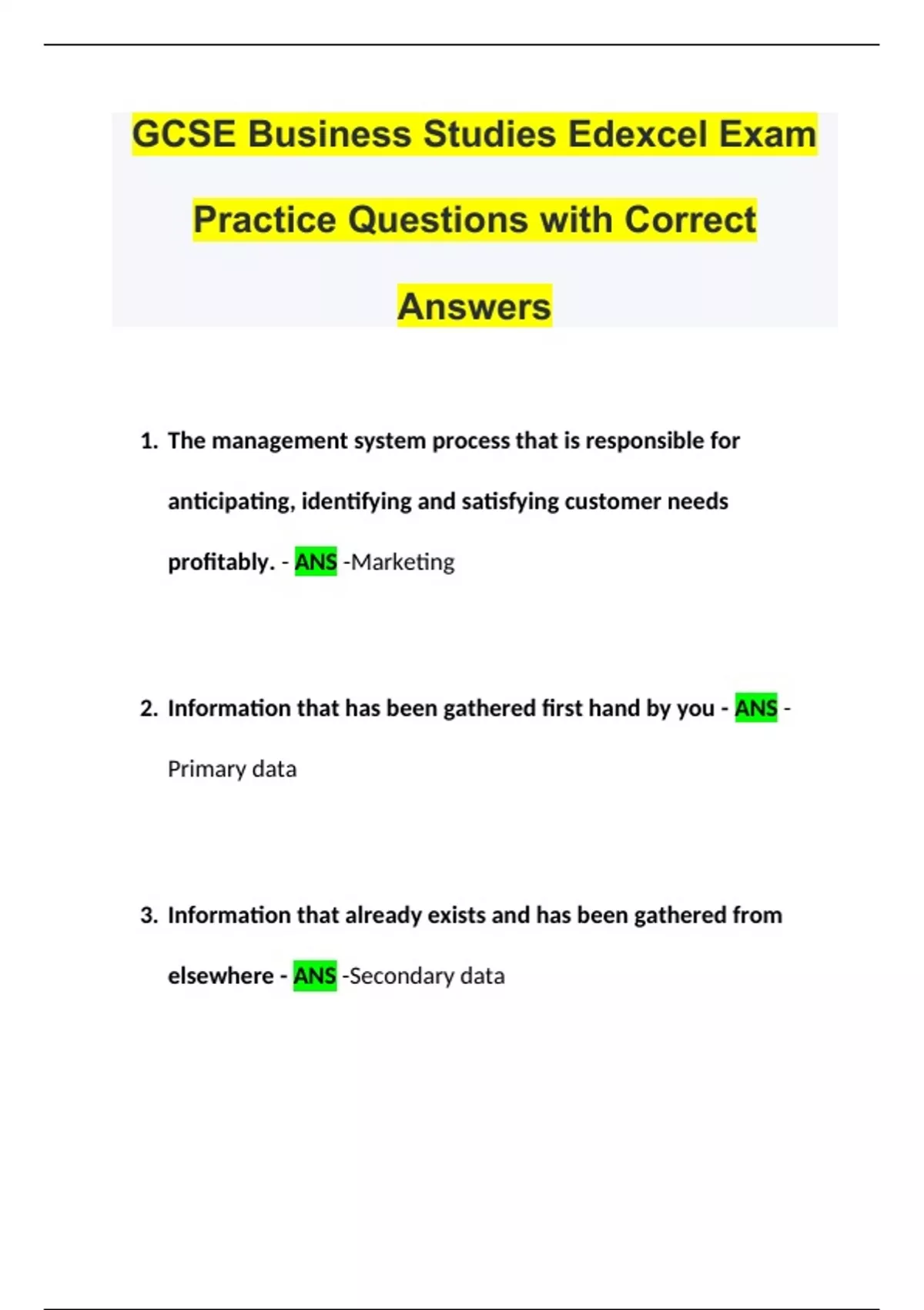 GCSE Business Studies Edexcel Exam Practice Questions with Correct Answers