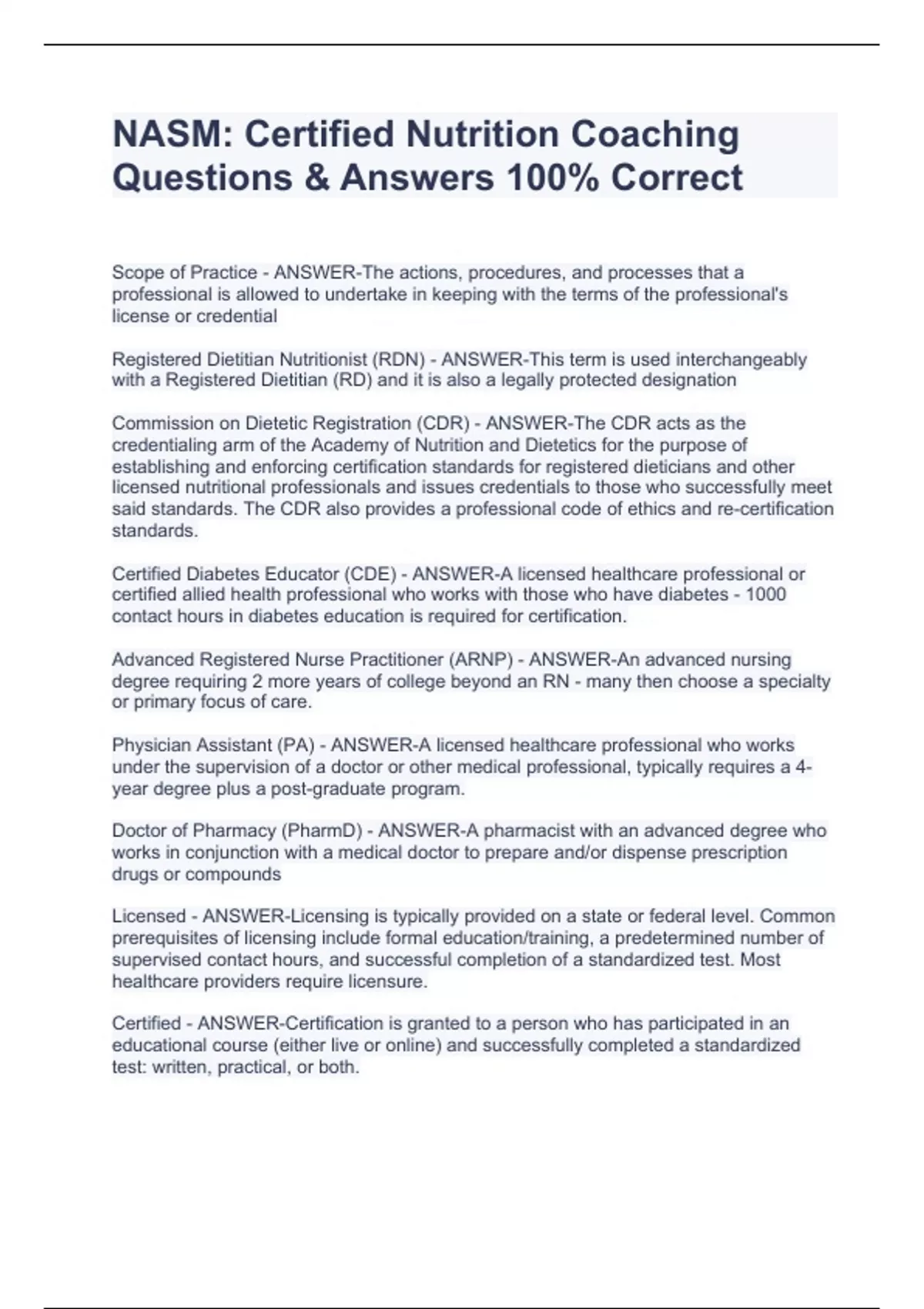 NASM: Certified Nutrition Coaching Questions & Answers 100% Correct NASM: Certified Nutrition Coaching Questions & Answers 100% Correct NASM: Certified Nutrition Coaching Questions & Answers 100% Correct NASM: Certified Nutrition Coaching Questions & Answers 100% Correct NASM: Certified Nutrition Coaching Questions & Answers 100% Correct Scope of Practice - ANSWER-The actions, procedures, and processes that a professional is allowed to undertake in keeping with the terms of the professional's license or credential Registered Dietitian Nutritionist (RDN) - ANSWER-This term is used interchangeably with a Registered Dietitian (RD) and it is also a legally protected designation Commission on Dietetic Registration (CDR) - ANSWER-The CDR acts as the credentialing arm of the Academy of Nutrition and Dietetics for the purpose of establishing and enforcing certification standards for registered dieticians and other licensed nutritional professionals and issues credentials to those who successfully meet