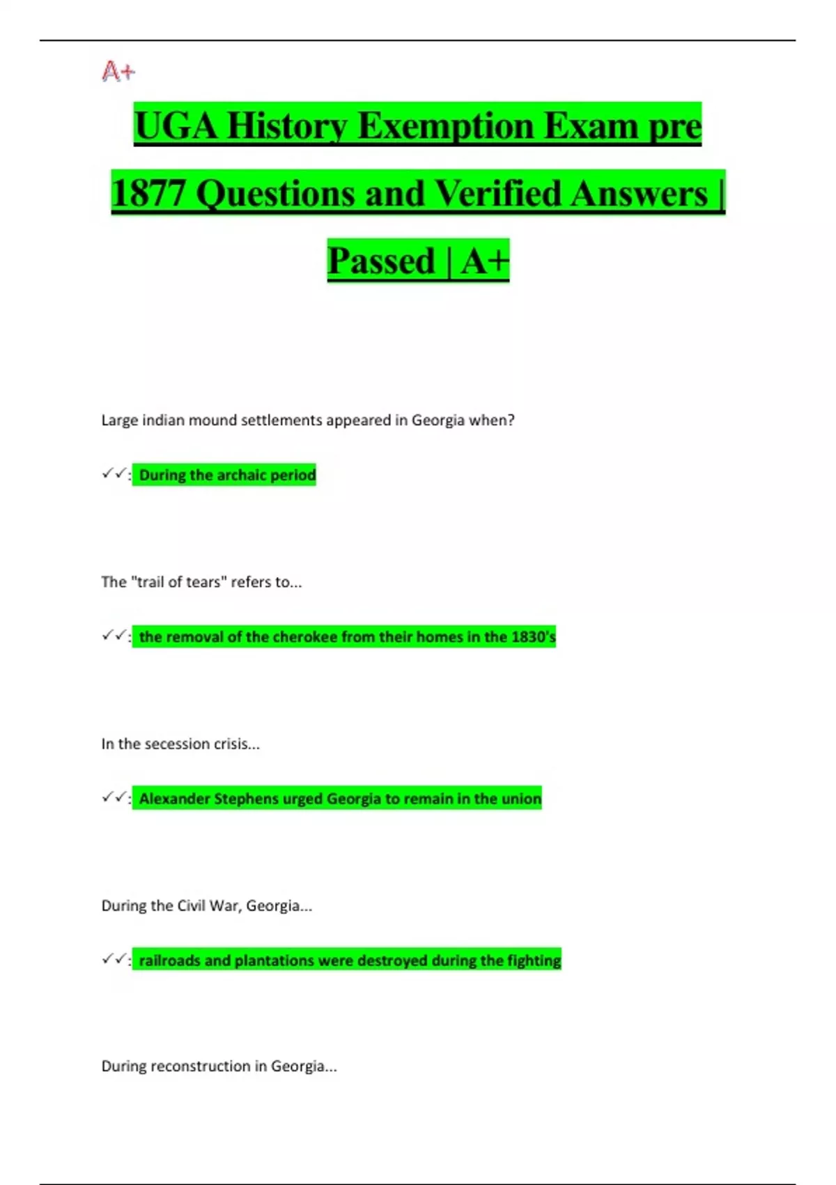 UGA History Exemption Exam pre 1877 Questions and Verified Answers | Passed | A+