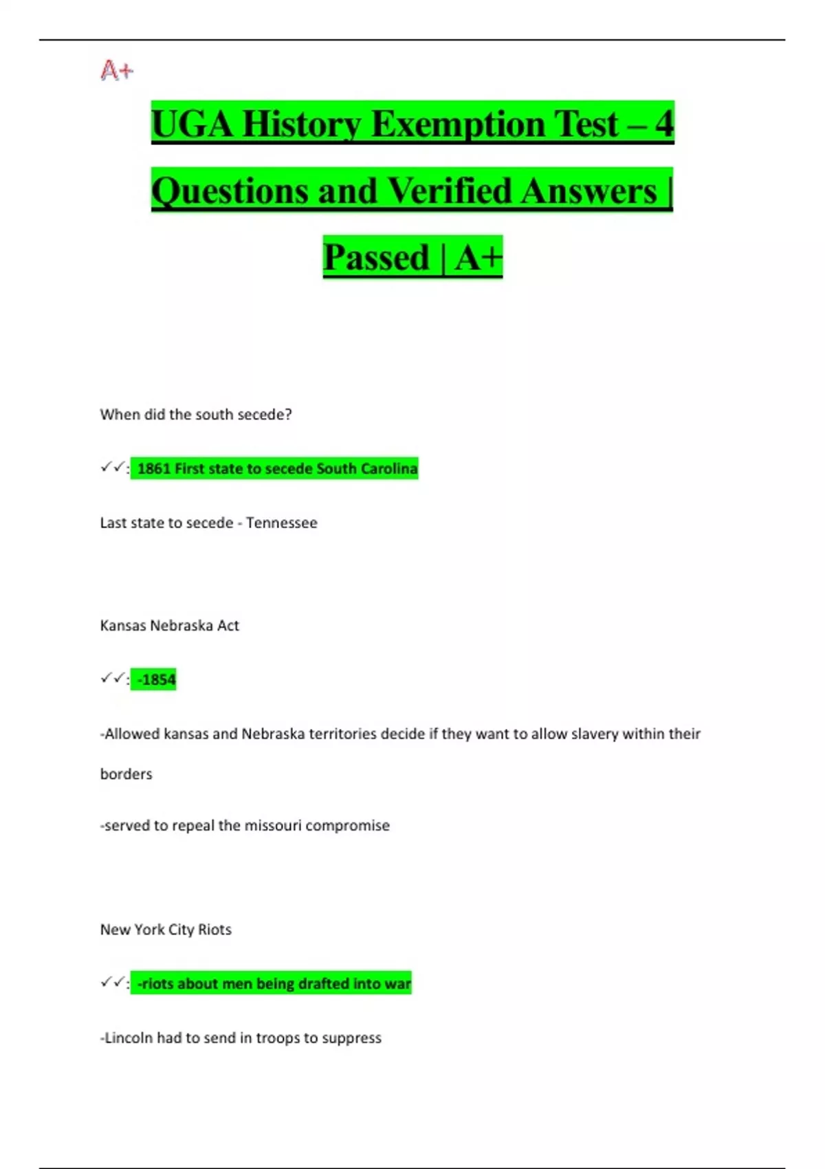 UGA History Exemption Test – 4 Questions and Verified Answers | Passed | A+