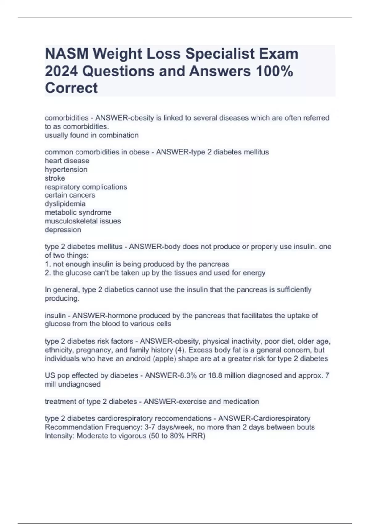 NASM Weight Loss Specialist Exam 2024 Questions and Answers 100% CorrectNASM Weight Loss Specialist Exam 2024 Questions and Answers 100% CorrectNASM Weight Loss Specialist Exam 2024 Questions and Answers 100% CorrectNASM Weight Loss Specialist Exam 2024 Questions and Answers 100% Correct comorbidities - ANSWER-obesity is linked to several diseases which are often referred to as comorbidities. usually found in combination common comorbidities in obese - ANSWER-type 2 diabetes mellitus heart disease hypertension stroke respiratory complications certain cancers dyslipidemia