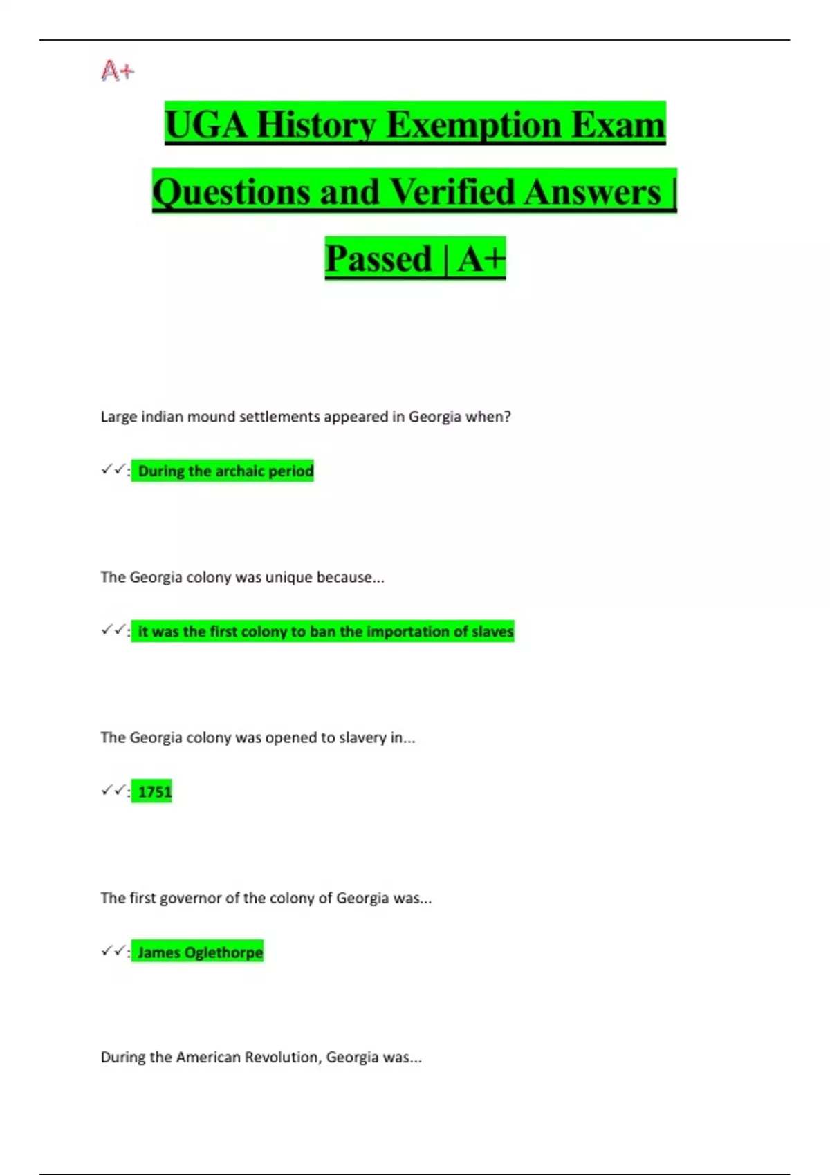 UGA History Exemption Exam Questions and Verified Answers | Passed | A+