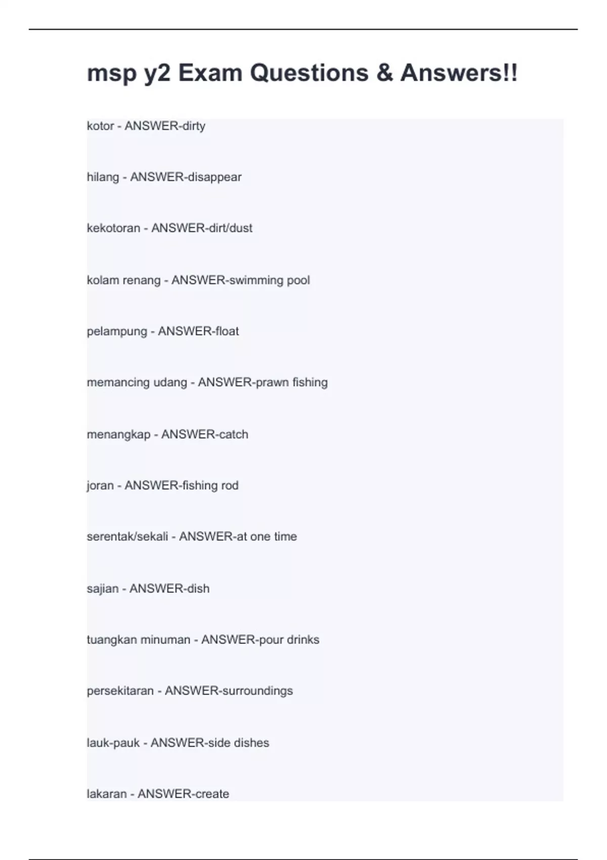 kotor - ANSWER-dirty hilang - ANSWER-disappear kekotoran - ANSWER-dirt/dust kolam renang - ANSWER-swimming pool pelampung - ANSWER-float memancing udang - ANSWER-prawn fishing menangkap - ANSWER-catch joran - ANSWER-fishing rod serentak/sekali - ANSWER-at one time sajian - ANSWER-dish