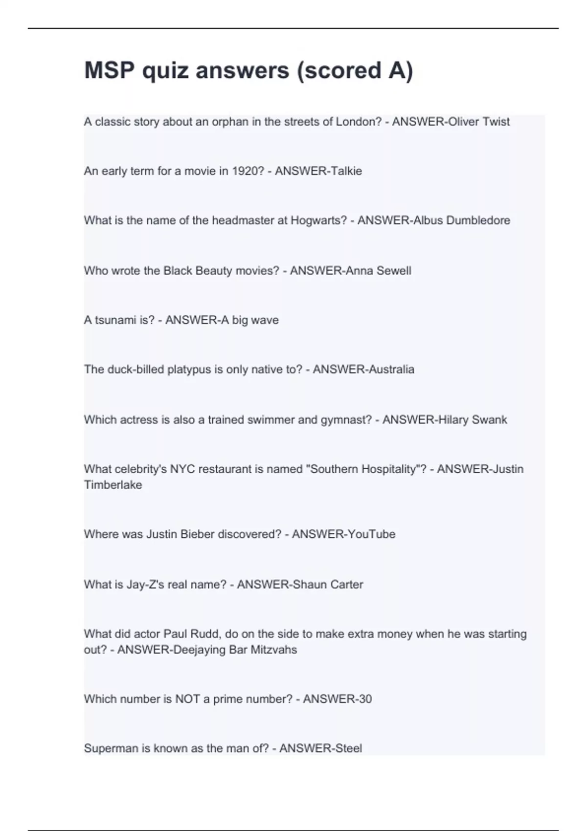 A classic story about an orphan in the streets of London? - ANSWER-Oliver Twist An early term for a movie in 1920? - ANSWER-Talkie What is the name of the headmaster at Hogwarts? - ANSWER-Albus Dumbledore Who wrote the Black Beauty movies? - ANSWER-Anna Sewell A tsunami is? - ANSWER-A big wave The duck-billed platypus is only native to? - ANSWER-Australia Which actress is also a trained swimmer and gymnast? - ANSWER-Hilary Swank What celebrity's NYC restaurant is named "Southern Hospitality"? - ANSWER-Justin Timberlake Where was Justin Bieber discovered? - ANSWER-YouTube What is Jay-Z's real name? - ANSWER-Shaun Carter What did actor Paul Rudd, do on the side to make extra money when he was starting out? - ANSWER-Deejaying Bar Mitzvahs Which number is NOT a prime number? - ANSWER-30 Superman is known as the man of? - ANSWER-Steel