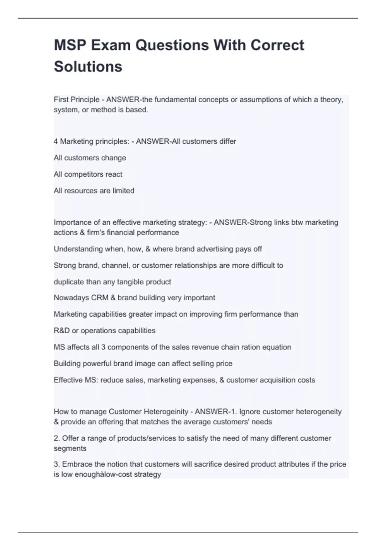 First Principle - ANSWER-the fundamental concepts or assumptions of which a theory, system, or method is based. 4 Marketing principles: - ANSWER-All customers differ All customers change All competitors react All resources are limited Importance of an effective marketing strategy: - ANSWER-Strong links btw marketing actions & firm's financial performance Understanding when, how, & where brand advertising pays off Strong brand, channel, or customer relationships are more difficult to duplicate than any tangible product Nowadays CRM & brand building very important Marketing capabilities greater impact on improving firm performance than R&D or operations capabilities MS affects all 3 components of the sales revenue chain ration equation Building powerful brand image can affect selling price Effective MS: reduce sales, marketing expenses, & customer acquisition costs How to manage Customer Heterogeinity - ANSWER-1. Ignore customer heterogeneity & provide an offering that matches the average customers' needs 2. Offer a range of products/services to satisfy the need of many different customer segments 3. Embrace the notion that customers will sacrifice desired product attributes if the price is low enoughàlow-cost strategy